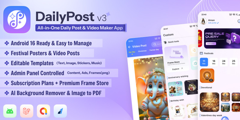 DailyPost - Android App Source Code. Create festival posters, business banners, daily posts and video posts with photo, logo and name. Includes Android app and admin p
