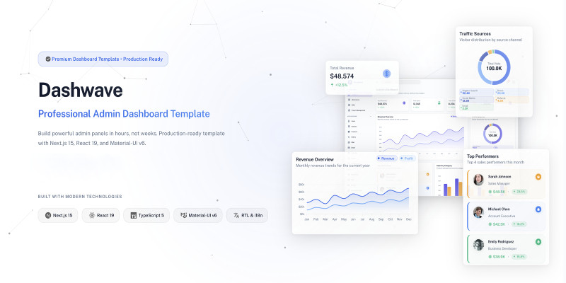 Dashwave - Next Js Admin Dashboard Template. Dashwave is a premium, feature-rich admin dashboard template built with the latest technologies. Designed for developers.