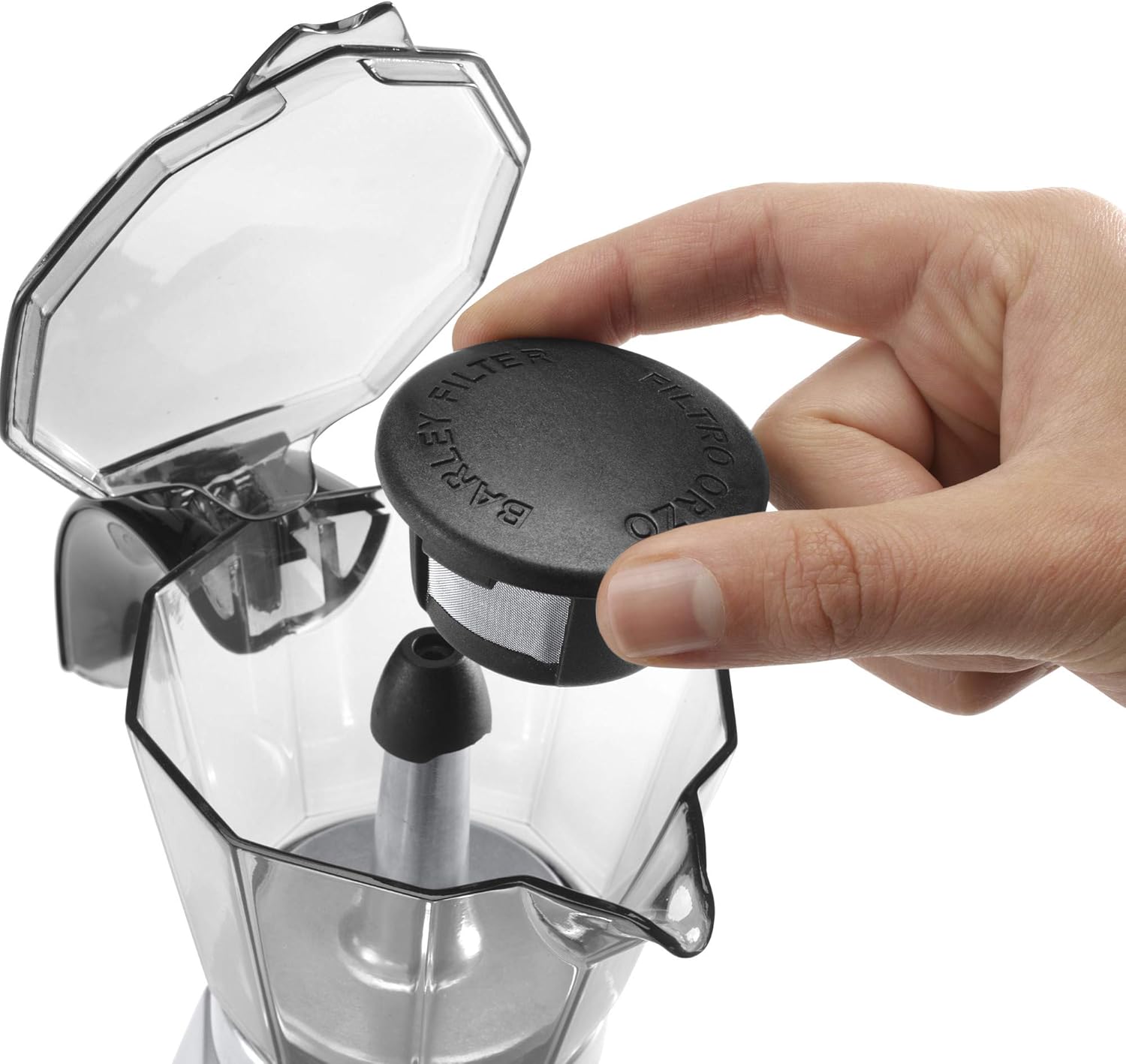 SUMMARY Digital and programmable 24 hour timer Auto shut off: mocha shuts down automatically Keep warm function: this special device keeps coffee hot for 30 minutes Transparent coffee cup and lid to monitor the coffee brewing process. Cool touch base: You can put your mocha on any surface, thanks to the cool touch base. 3 or 6 cups: You can make 6 cups of coffee or 3 cups by using the special 3 cup adapter. Independent base: cordless coffee maker with 360° rotating base Barley function with special filters Aroma function, to choose the desired coffee in strong, medium or light Key Features: Digital and programmable 24 hour timer Auto shut off: mocha shuts down automatically Keep warm function: this special device keeps coffee hot for 30 minutes Transparent coffee cup and lid to monitor the coffee brewing process. Cool touch base: You can put your mocha on any surface, thanks to the cool touch base. 3 or 6 cups: You can make 6 cups of coffee or 3 cups by using the special 3 cup adapter. Independent base: cordless coffee maker with 360° rotating base Barley function with special filters Aroma function, to choose the desired coffee in strong, medium or light