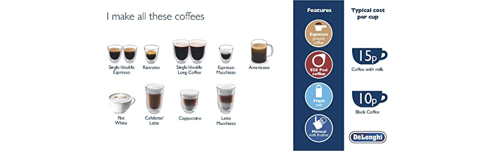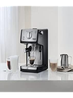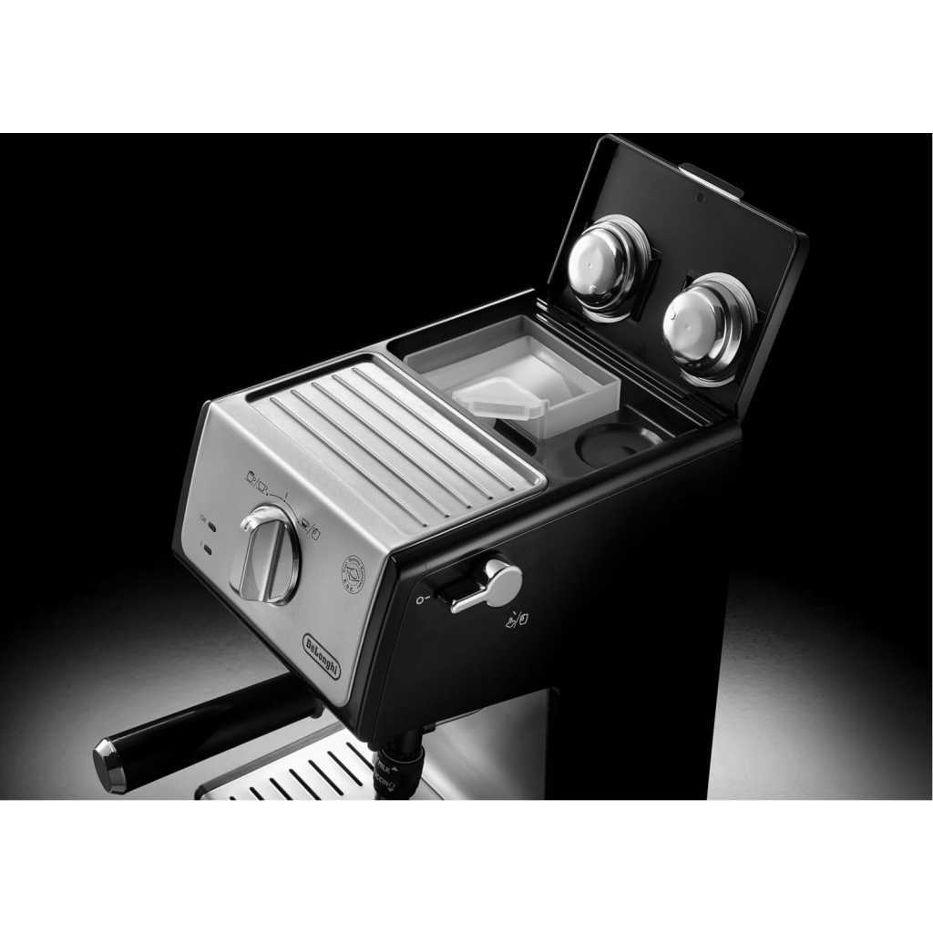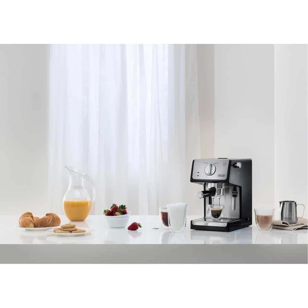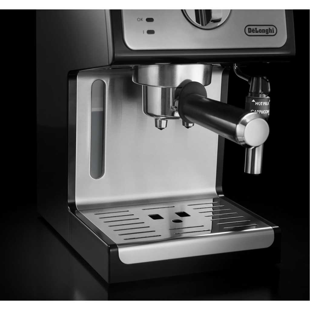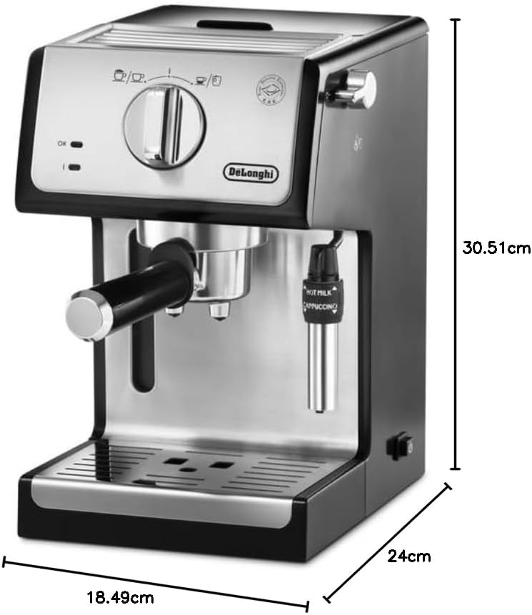 Key Features: Authentic Barista Experience: Enjoy rich, flavourful espresso, cappuccino, and lattes with the De’Longhi ECP35.31 Traditional Barista Pump Espresso Machine, featuring a premium finish and sleek black design for a professional coffee experience at home. Customizable Milk Frothing: Create perfect frothy milk for cappuccinos or silky microfoam for lattes with the adjustable milk frother, designed to elevate your coffee creations to café-quality levels. Versatile Brewing Options: Use your choice of ground coffee or convenient E.S.E pods, providing flexibility and ease of use to brew your favourite coffee style effortlessly. Convenient 1-Litre Water Tank: The transparent, removable water reservoir offers a generous 1.1-liter capacity, ensuring minimal refills and easy monitoring for a hassle-free coffee-making experience. Flexible Double Drip Tray: Accommodates taller cups with its removable double drip tray, making it easy to prepare a wide variety of coffee drinks, from espresso shots to larger latte glasses.
