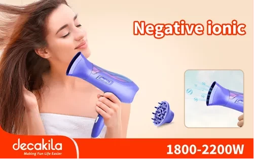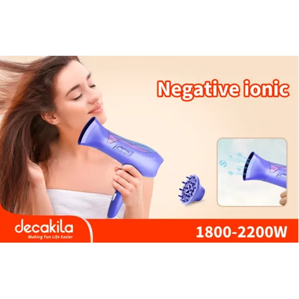 Decakila 2200W Hair Dryer, KEHS032Z. Wattage:1800-2200W Voltage:220-240V 50/60Hz With ionic function 2 speed & 3 heat settings DC motor Cold shot button Hang up hook With 1.8M cord With 1 Pcs nozzle With 1 Pcs diffuser Packed by color box Key Features: Decakila 2200W Hair Dryer, KEHS032Z. Wattage:1800-2200W Voltage:220-240V 50/60Hz With ionic function 2 speed & 3 heat settings DC motor Cold shot button Hang up hook With 1.8M cord With 1 Pcs nozzle With 1 Pcs diffuser Packed by color box
