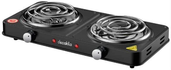 Key Features: Decakila 240V, 2 burner, Portable Hot Plate, KECC002B. Voltage: 220-240V 50-60Hz Power: 1000W+1000W Two burners Portable Electric stove Stainless burner cap 5 heat settings Packed by color box