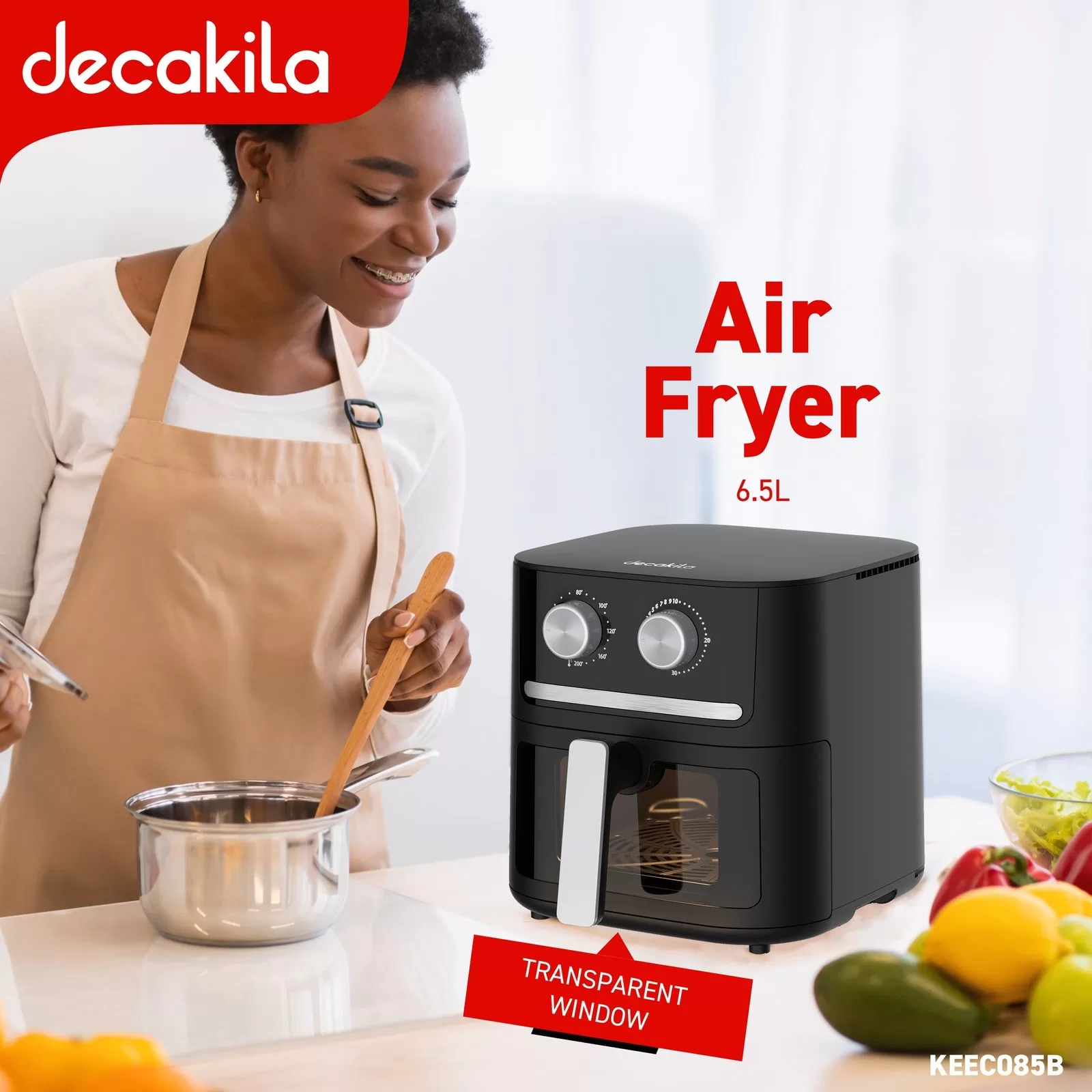 Key Features: Decakila 6.5 L Air Fryer, 1600 Watts, KEEC085B. Capacity: 6.5L Wattage: 1600W Voltage: 220-240V 50-60Hz With Visible window Single pot with a non-stick coat With Overheat protection 60 min timer automatically shuts off for precise cooking Adjustable temperature of 80-200 degrees for different recipes Carbon fiber heating tube Non-slip feet no unpleasantly smell on frying