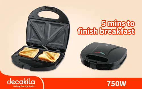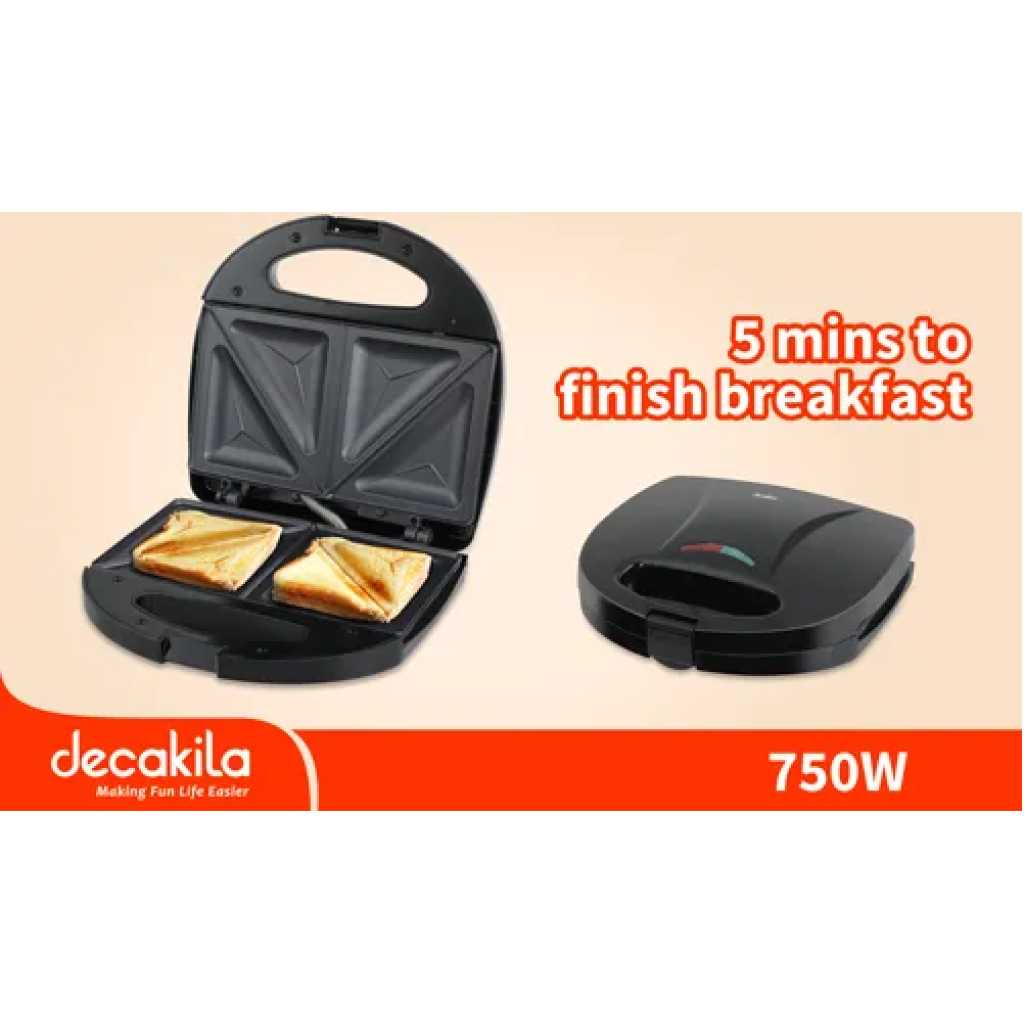 Decakila 750w Sandwich Maker, KEEC046B. The Decakila 750W Sandwich Maker (KEEC046B) is a powerful kitchen essential designed to delight your taste buds. With a wattage of 750W and a voltage range of 220-240V, enjoy quick and easy sandwich making. Its vertical storage feature, thermostat control, and non-stick coating ensure a seamless cooking experience. Wattage: 750W Voltage: 220-240V 50-60Hz Plate size: L215×W125mm With vertical storage Sandwich making plates Cooking plate temp: 180±10℃ Preheat time: 90-150s Thermostat control Non-stick coating Working status:105℃ With indicator light Anti-slip feet Cord storage Packed by color box Key Features: Decakila 750w Sandwich Maker, KEEC046B. Wattage: 750W Voltage: 220-240V 50-60Hz Plate size: L215×W125mm With vertical storage Sandwich making plates Cooking plate temp: 180±10℃ Preheat time: 90-150s Thermostat control Non-stick coating Working status:105℃ With indicator light Anti-slip feet Cord storage Packed by color box