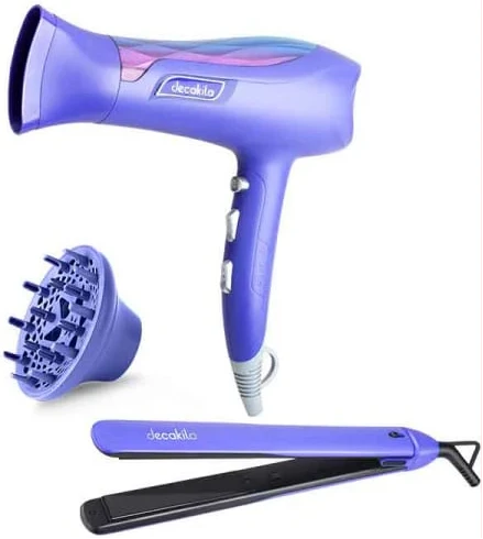 Key Features: Decakila Hair Styler Set KEHS041Z | 2200W, 200 degrees, Hair Dryer. Wattage: 1800-2200W Voltage: 220-240V 50/60Hz Max temperature 200°C With ceramic coating plates Aluminum floating plates LED Indicator light PTC heating element With lock function 360° Swivel cord With 1.7M cord Heat board size: 100*25mm With ionic function 2 Speed & 3 heat settings DC motor Cold shot button Hang up hook With 1 Pcs nozzle With 1 Pcs diffuser Packed by color box