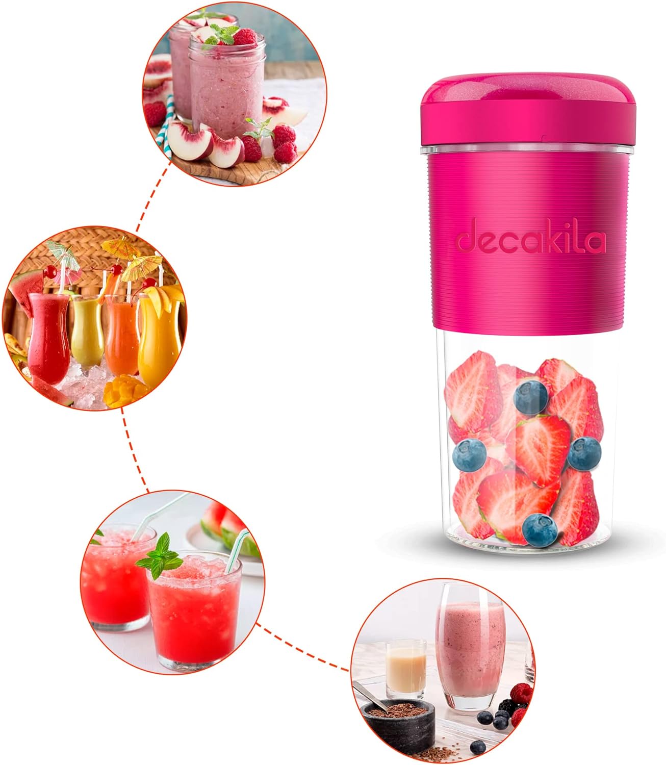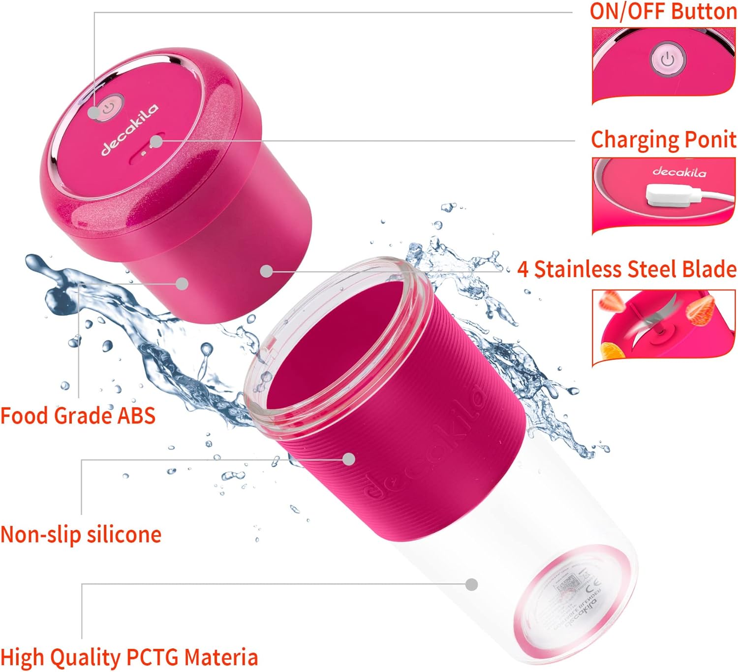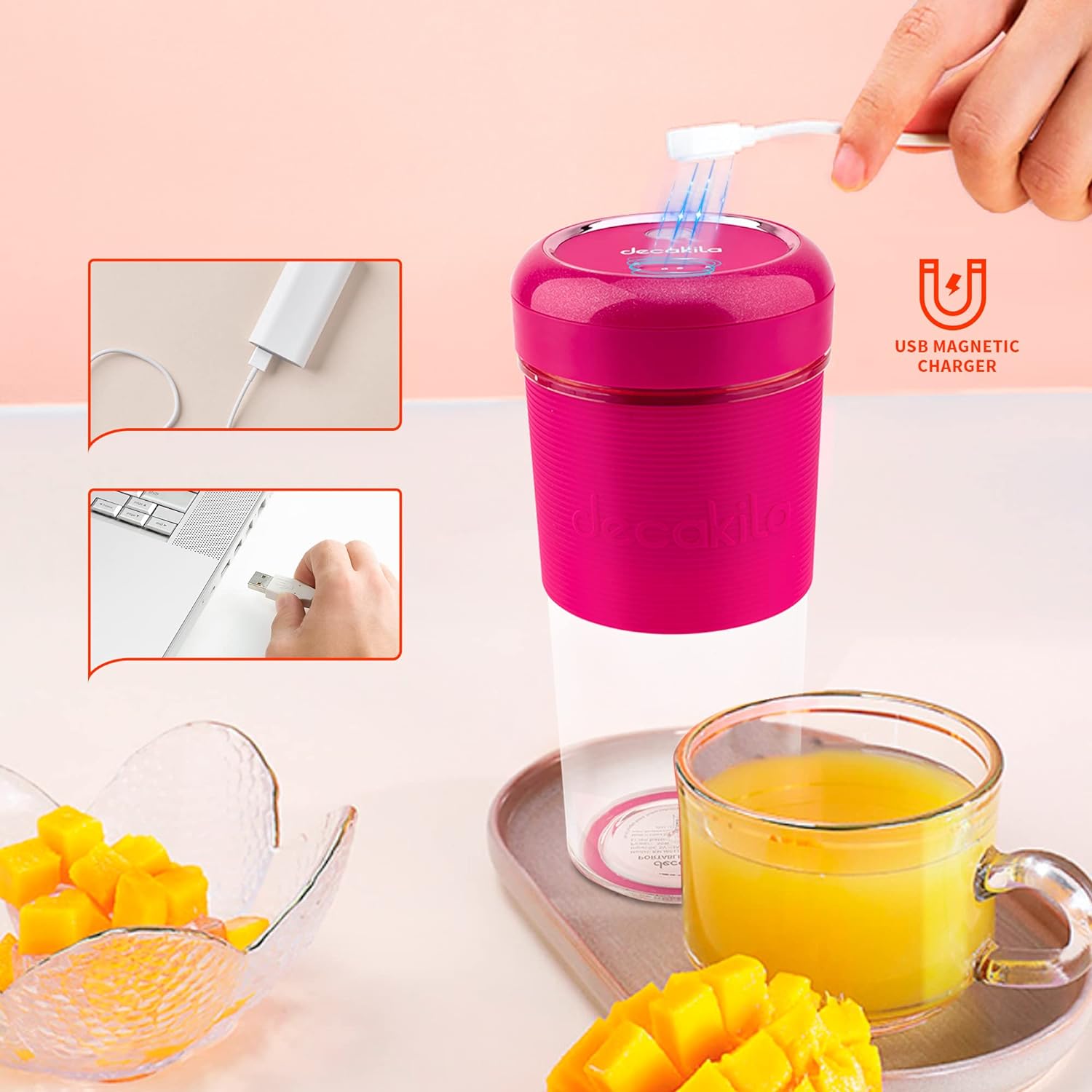 Capacity 300ml; Large capacity 300ml; Weight only 0.88 lbs; Compact, easy to carry; Enjoy the delicious and healthy juice anywhere you can take it when traveling, camping or office Powerful motor: 1200*2mAh, 3.7V motor can be perfectly crushed and mixed in 40 seconds USB Fast Charging The built in USB magnetic battery can be carried around, more convenient, stable, can be easily charged by mobile power, laptops, computers and other devices EASY OPERATION WITH ONE TOUCH Mini blender with one touch operation, double click to start and prevent abuse to protect you and your family safety Thoughtful details: non-slip cup sleeve to increase friction and prevent falling. Two stainless steel blades, durable Key Features: Capacity 300ml; Large capacity 300ml; Weight only 0.88 lbs; Compact, easy to carry; Enjoy the delicious and healthy juice anywhere you can take it when traveling, camping or office Powerful motor: 1200*2mAh, 3.7V motor can be perfectly crushed and mixed in 40 seconds USB Fast Charging The built in USB magnetic battery can be carried around, more convenient, stable, can be easily charged by mobile power, laptops, computers and other devices EASY OPERATION WITH ONE TOUCH Mini blender with one touch operation, double click to start and prevent abuse to protect you and your family safety Thoughtful details: non-slip cup sleeve to increase friction and prevent falling. Two stainless steel blades, durable