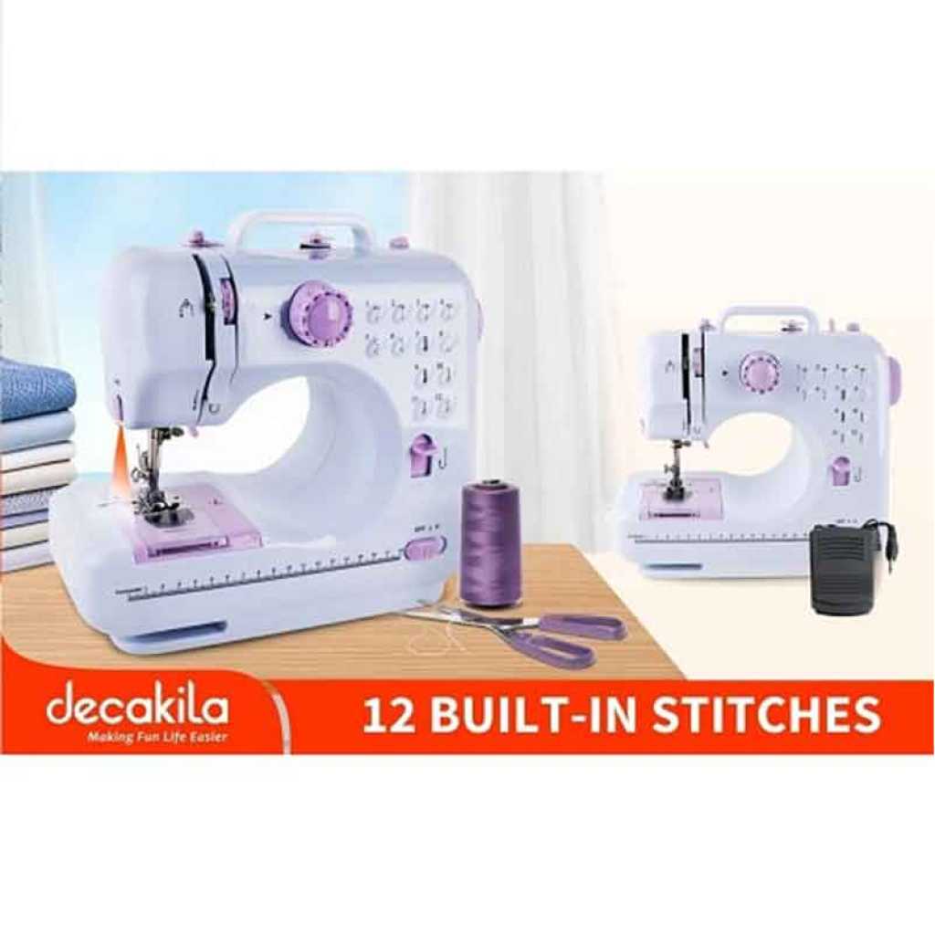 Decakila Sewing Machine With 12 Built-in Stitch Patterns 4 AA Batteries, Double Thread, Double Speed KUTT031W Bring your ideas to life with this Decakila machine and start all the projects you have in mind. Perfect for those who want to evolve in the art of crafts. You will be able to sew whatever you want with your machine. The best option for your home This machine is suitable for those who want to start learning sewing. Functional and easy to use, you will be able to repair garments, sew simple tears and make your own textile designs. Everywhere Because it is light, you will be able to transport it wherever you go. Take your sewing everywhere and be encouraged to create anywhere. Double thread, double speed Automatic thread rewind Sews sleeves Built-in sewing light Includes thread cutter Use hand switch or foot pedal to start Double thread,double speed Featuring 12 built-in stitch patterns Forward and reverse sewing Automatic thread rewind Sews sleeves function Drawer included Button and button hole sewing function Built-in sewing light Includes thread cutter Including all-purpose presser foot replacement holder Uses DC6V 1200mA power or 4 AA batteries (not included) Uses hand switch or foot pedal to start With 1 Pcs foot pedal With 1 Pcs adaptor With 1 Pcs thread bag With 1 Pcs Adaptor (VDE to UL) Product weight:1943g Product size:27.5*12.1*26cm Packed by color box