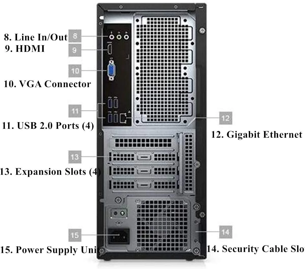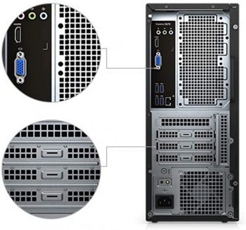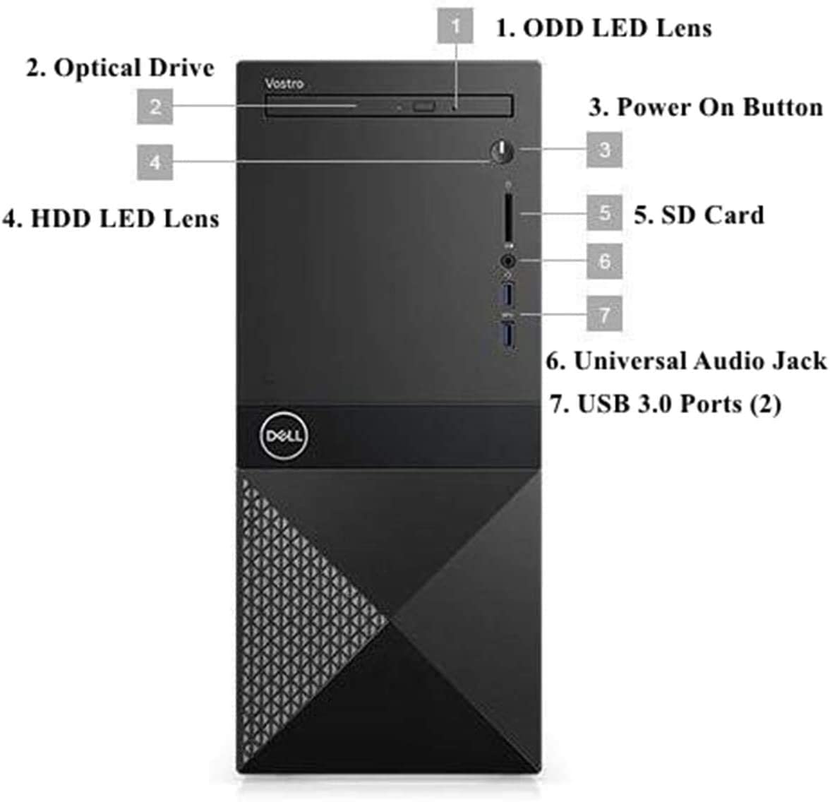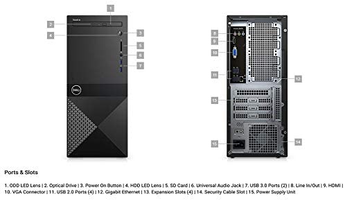 Dell Vostro 3671 i3 Tower Desktop. Featuring versatile, space-saving form factors with customized deployment options and 3th gen Intel® Core™ Processors. Dell Vostro 3671 Tower Desktop Features Desk-friendly design Cool factor: The unique mesh design on the front of the system incorporates additional vents, for reduced dust, faster cooling and an overall improvement in performance. Color options vary by region. Space saver: With a small footprint, the Vostro tower leaves plenty of desk space open while keeping ports within easy reach. Seamless security Encryption de-mystified: Enjoy commercial-grade security including Hardware TPM 2.0—hardware protection and storage for encryption keys that verify your device as unique and trusted. Restricted access: Be assured that unauthorized users aren’t accessing your systems thanks to Bitlocker, offering options for multi-factor authentication and system lock-down without the appropriate personal identification number (PIN). Ports & Slots 1. ODD LED Lens – 2. Optical Drive – 3. Power On Button – 4. HDD LED Lens – 5. SD Card – 6. Universal Audio Jack – 7. USB 3.0 Ports (2) – 8. Line In/Out – 9. HDMI – 10. VGA Connector – 11. USB 2.0 Ports (4) – 12. Gigabit Ethernet – 13. Expansion Slots (4) – 14. Security Cable Slot – 15. Power Supply Unit Dimensions & Weight 1. Width: 160mm (6.3″) – 2. Depth: 289mm (11.39″) – 3. Height: 373.6mm (14.71″) – Starting weight: 5.27kg (11.6 lbs) Key Features: CPU: 9th Generation Intel Core i5-9400 Processor 2.90 GHz (6 Cores, 9M Cache, up to 4.10 GHz). RAM: 8GB DDR4-2400 SDRAM; Hard disk: 1TB 7200 rpm HDD; Optical drive: Tray-loaded DVD drive (reads and writes to DVD / CD) Graphics: Intel UHD Graphics 630 with shared graphics memory Connectivity: 802.11bgn + Bluetooth 4.0, 1×1; Port: 2x USB 3.0, 4x USB 2.0, 1x HDMI, 1x Audio Line Out, 1x Microphone In, SD Card Authorized Snap Package – Includes 3-in-1 Design Stylus (Stylus + Pen + 64GB USB 3.0 Flash Drive), Authorized Sellers Only. Operating system: Windows 10 Professional English 64 bits; Colors: Black with silver trim; Wired keyboard and mouse