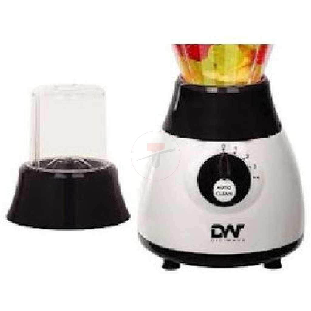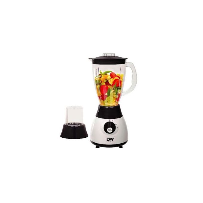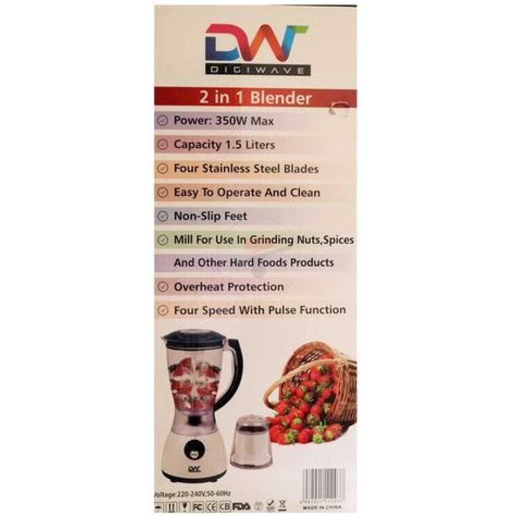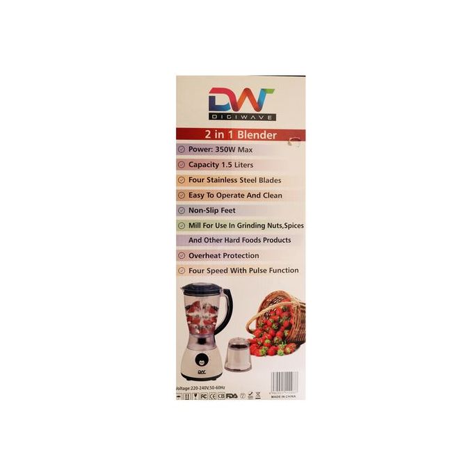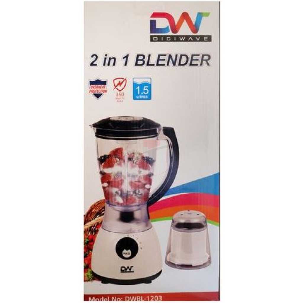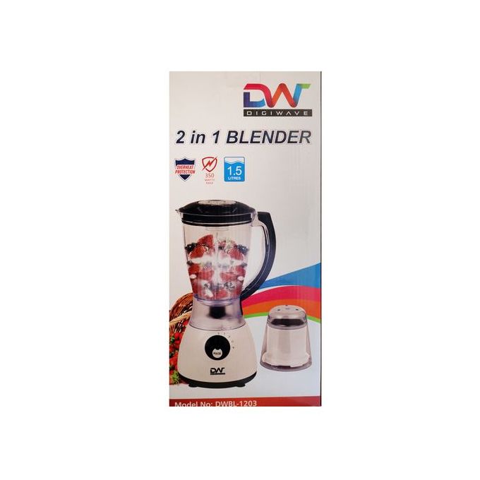 Digiwave 2 In 1 DWBL-1203 1.5L Blender & Grinder – White & Black. DIGIWAVE Blender BL-1203 Whether you’re looking to make a nice smoothie to start your day, or a fresh salad for lunch, this Blender is the one for you. This product acts as a regular blender with a plastic jar, but also comes equipped with 2 other attachments for a glass jar and mill allowing you to carry out many different tasks with this one simple appliance. The pulse function gives you complete control as to how long you wish to run the blender on high-speed and also assists in the auto-clean function when used with a little warm water. We emphasize that the auto-clean feature is only useful for a quick clean-up but a regular cleaning will still be required on occasion for a more effective job. Key Features: Digiwave 2 In 1 DWBL-1203 1.5L Blender & Grinder – White & Black. 350 Watts Motor 1.5 liters jar capacity 2 attachments – plastic jar and grinder 4-speed control with pulse function Metal lined grinding mill Stainless steel blades