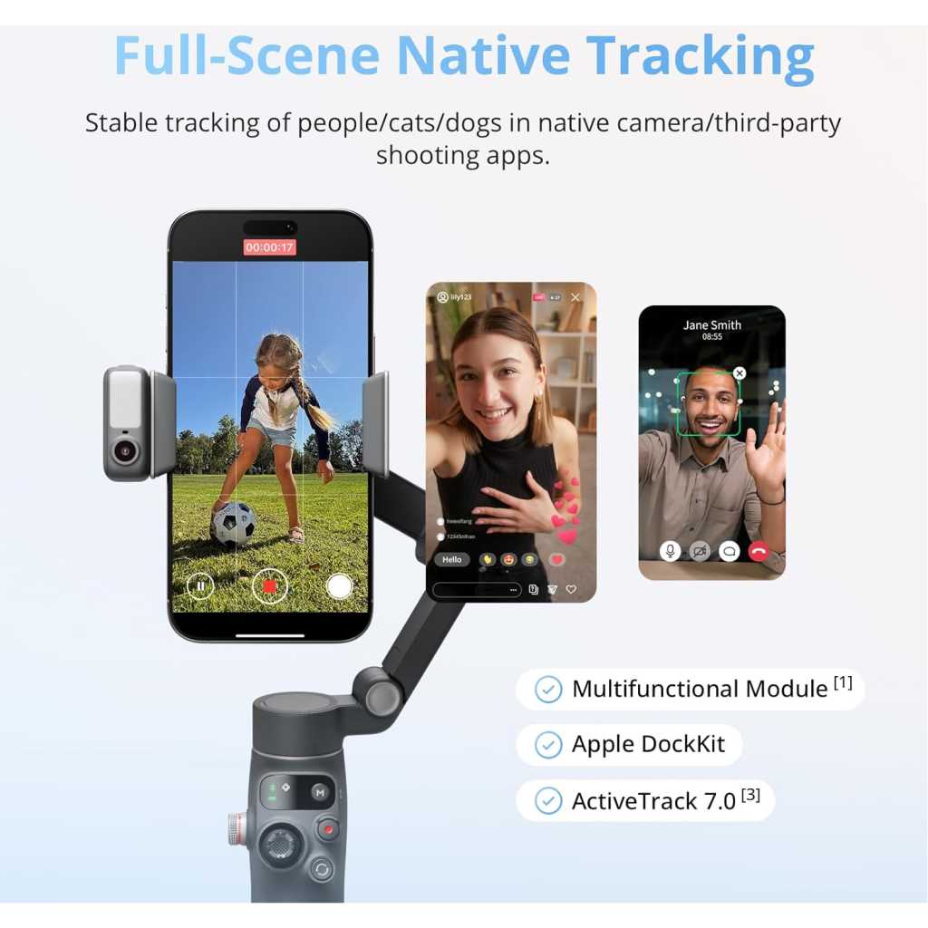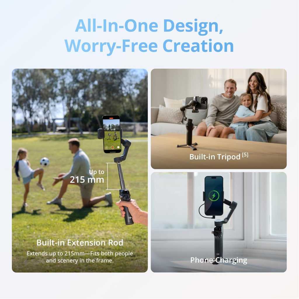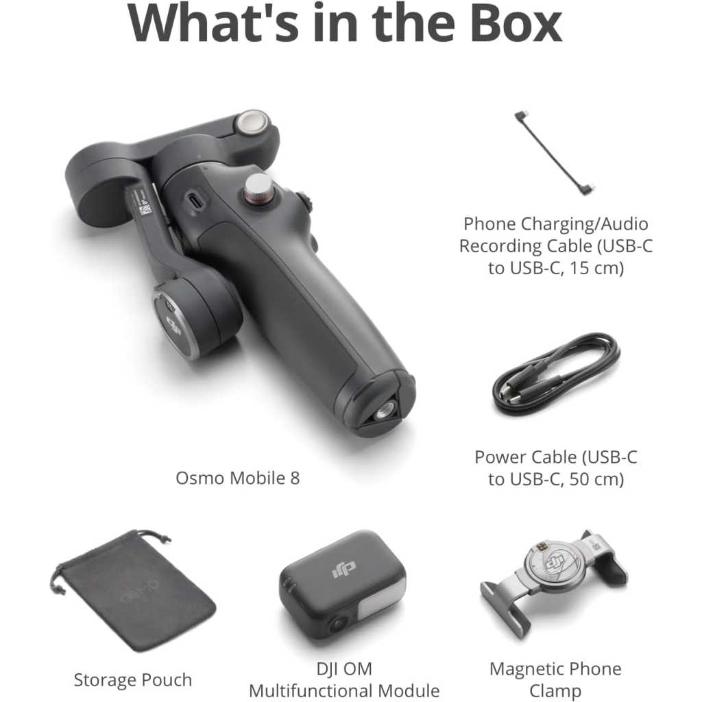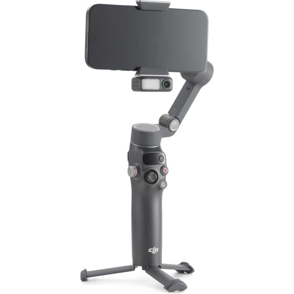 Key Features: Native Tracking With Audio [4] & Lighting [1] – Level up your shots with a DJI gimbal that combines tracking, audio reception [4], and lighting. Stay sharply in focus, well-lit, and crystal clear. Seamless 360° Pan Rotation – Enjoy 360° horizontal rotation for immersive shots. Intelligent tracking lets you follow subjects freely, and the built-in tripod/selfie stick adds more flexibility. Direct Phone Connection for Tracking [2] – Instantly connect your phone to the foldable gimbal for quick setup and intelligent tracking. Portable and easy to use for on-the-go shooting. Ultra-Comfortable Grip with Built-in Tripod for Low-Angle Shots – This gimbal is ideal for capturing kids or pets in action, creative skateboarding shots, or new vlogging angles with a Selfie Stick, all without wrist strain. Built-in Extension Rod [5] & Tripod – No extra gear required! Capture group selfies or wide travel shots with this DJI gimbal. Set up anywhere—from city parks to family parties—for hands-free filming. 10-Hour Battery [8] & Phone Charging – Shoot for hours at events or on the go with a long-lasting gimbal. Charge your phone as you film—ideal for festivals, travel, and live streaming. Robust 3-Axis Gimbal Stabilization – Whether you’re chasing action shots or filming daily vlogs, this gimbal’s advanced 3-axis stabilization ensures smooth, professional footage. Easy Tutorials & One-Tap Editing – New to phone gimbals? Get started fast with simple tutorials and easy, one-tap editing. Create and share great-looking videos in minutes. Includes the gimbal, Multifunctional Module, Magnetic Phone Clamp, etc. Enjoy native tracking with integrated audio & lighting capabilities. Great for daily recording, vlogging, or live streaming. Due to platform compatibility issues, the DJI Mimo app has been removed from Google Play. For a better product experience, please visit the official DJI website to download the latest version of DJI Mimo.