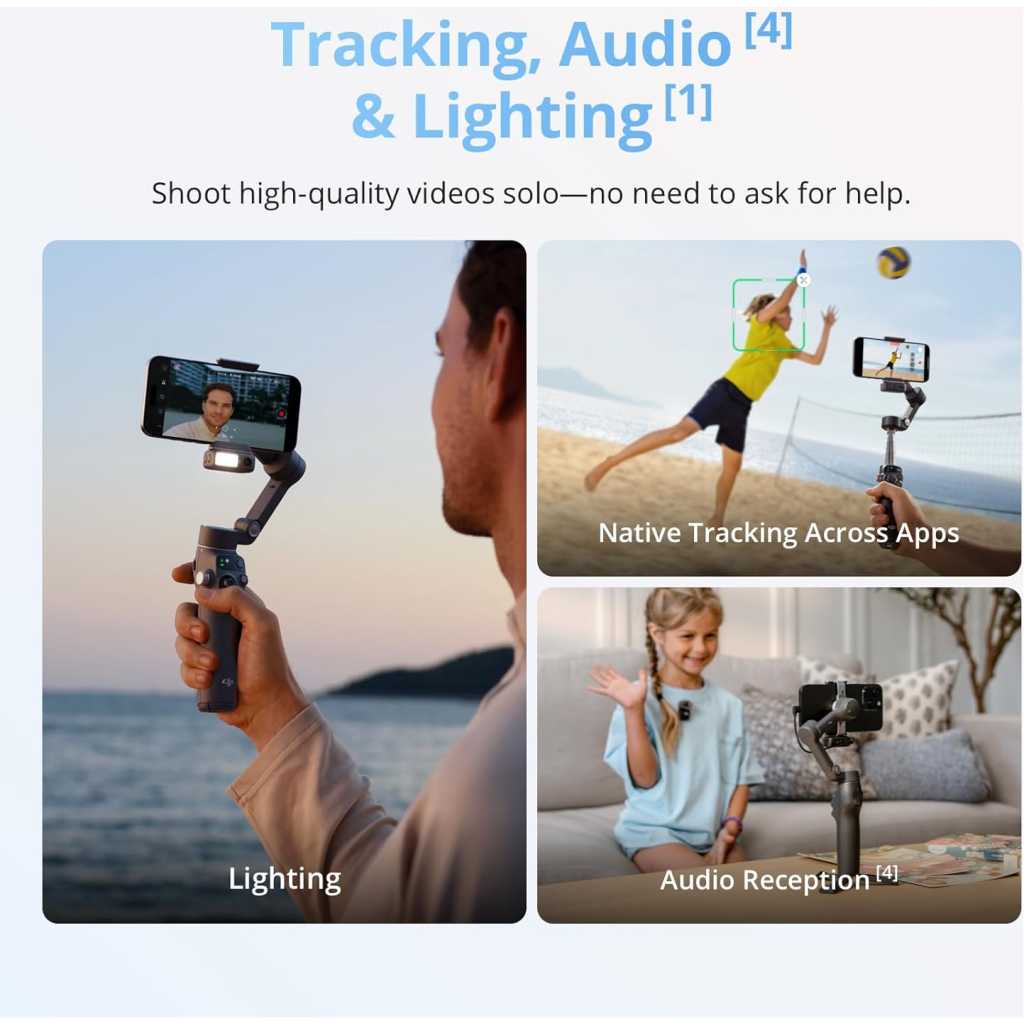 Native Tracking With Audio [4] & Lighting [1] – Level up your shots with a DJI gimbal that combines tracking, audio reception [4], and lighting. Stay sharply in focus, well-lit, and crystal clear. Seamless 360° Pan Rotation – Enjoy 360° horizontal rotation for immersive shots. Intelligent tracking lets you follow subjects freely, and the built-in tripod/selfie stick adds more flexibility. Direct Phone Connection for Tracking [2] – Instantly connect your phone to the foldable gimbal for quick setup and intelligent tracking. Portable and easy to use for on-the-go shooting. Ultra-Comfortable Grip with Built-in Tripod for Low-Angle Shots – This gimbal is ideal for capturing kids or pets in action, creative skateboarding shots, or new vlogging angles with a Selfie Stick, all without wrist strain. Built-in Extension Rod [5] & Tripod – No extra gear required! Capture group selfies or wide travel shots with this DJI gimbal. Set up anywhere—from city parks to family parties—for hands-free filming. 10-Hour Battery [8] & Phone Charging – Shoot for hours at events or on the go with a long-lasting gimbal. Charge your phone as you film—ideal for festivals, travel, and live streaming. Robust 3-Axis Gimbal Stabilization – Whether you’re chasing action shots or filming daily vlogs, this gimbal’s advanced 3-axis stabilization ensures smooth, professional footage. Easy Tutorials & One-Tap Editing – New to phone gimbals? Get started fast with simple tutorials and easy, one-tap editing. Create and share great-looking videos in minutes. Includes the gimbal, Multifunctional Module, Magnetic Phone Clamp, etc. Enjoy native tracking with integrated audio & lighting capabilities. Great for daily recording, vlogging, or live streaming. Due to platform compatibility issues, the DJI Mimo app has been removed from Google Play. For a better product experience, please visit the official DJI website to download the latest version of DJI Mimo.