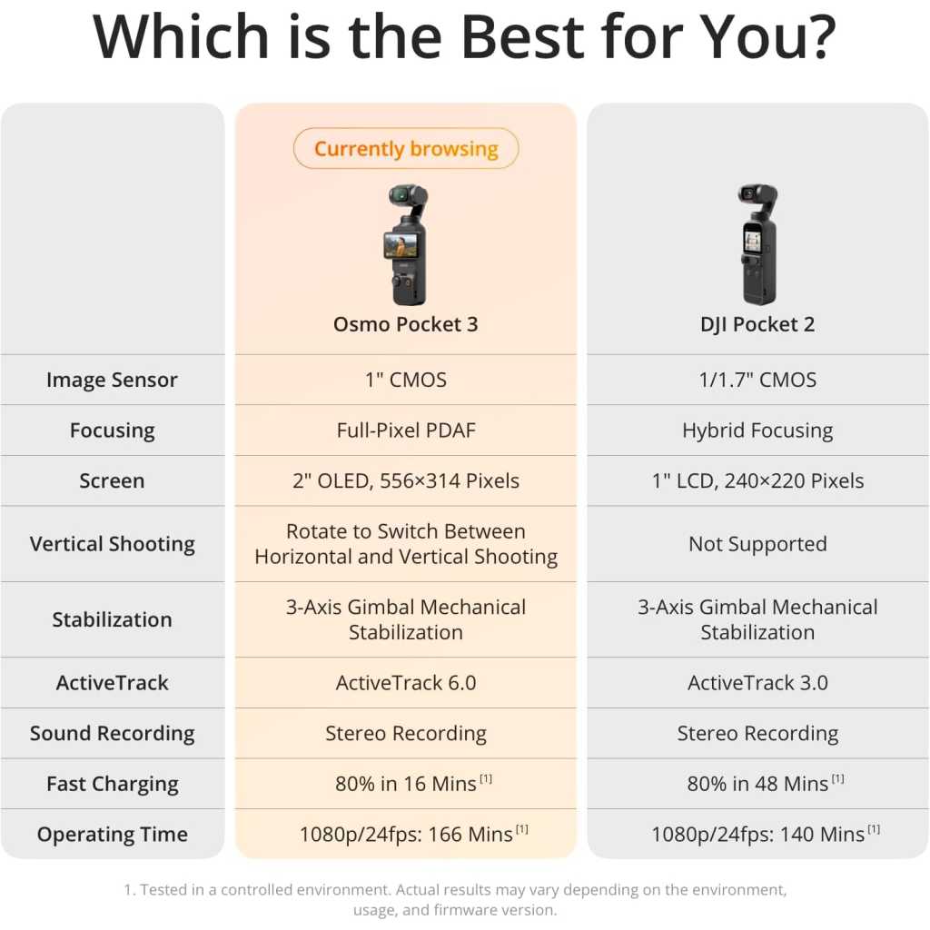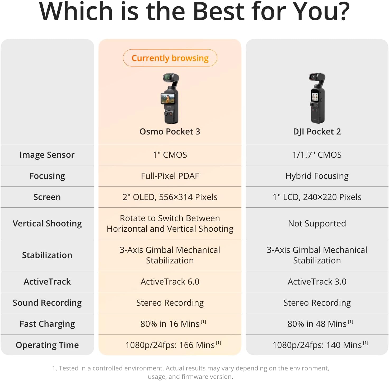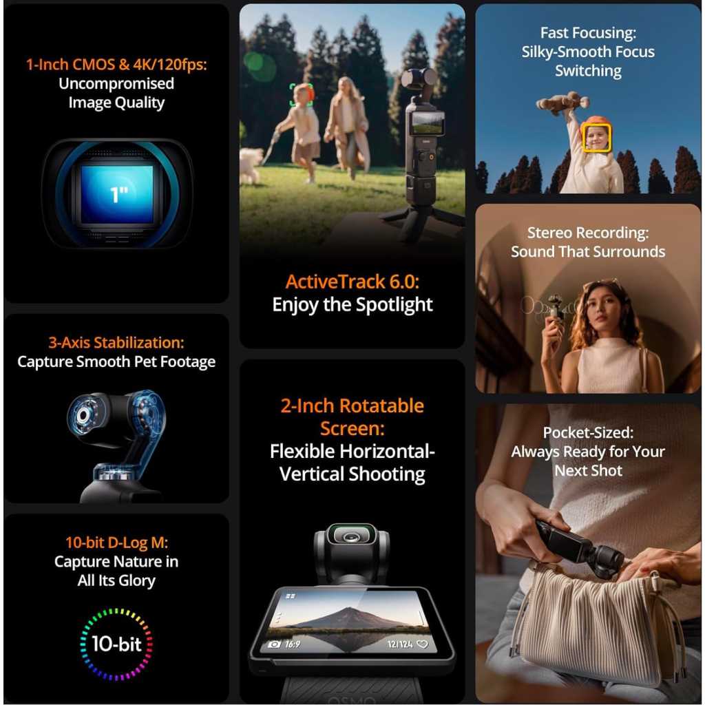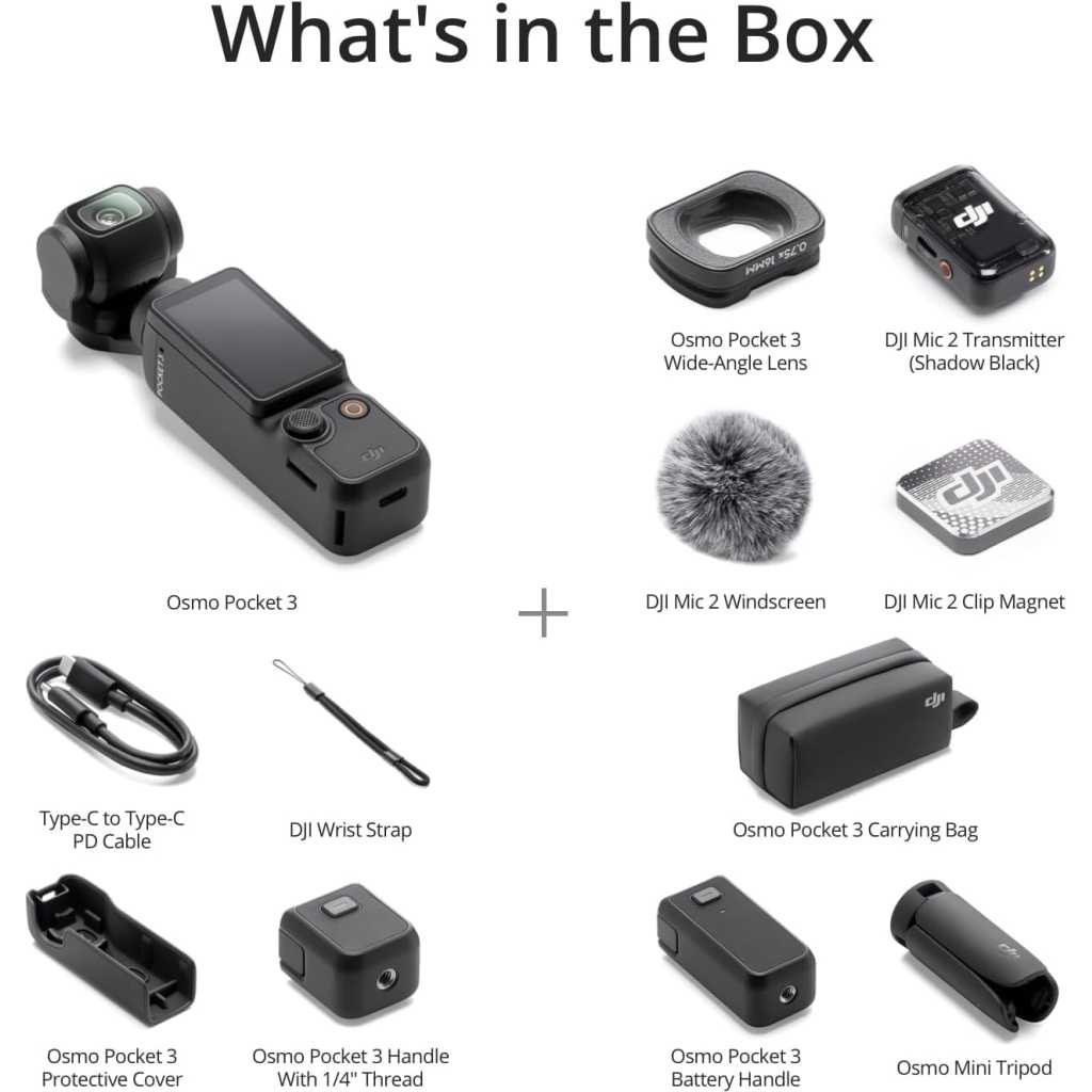 DJI Osmo Pocket 3 Creator Combo, Vlogging Camera with 1” CMOS, 4K/120fps Video, 3-Axis Stabilization, Face/Object Tracking, Fast Focusing, Mic Included for Clear Sound, Digital Camera for Photography. Capture Stunning Footage – This vlogging camera features a 1-inch CMOS sensor and records in 4K resolution at an impressive 120fps. Capture breathtaking night views and sunsets with enhanced clarity. Effortlessly Frame Your Shots – Get the ideal composition with Osmo Pocket 3’s expansive 2-inch touch screen that rotates for both horizontal and vertical shooting. Ultra-Steady Footage – Say goodbye to shaky videos. Osmo Pocket 3’s advanced 3-axis mechanical stabilization delivers superb stability. Enjoy smooth footage while dancing, chasing pets, or vlogging. Create Captivating Vlogs With ActiveTrack 6.0 – Stay effortlessly in focus as you record on the go. Set Osmo Pocket 3 up on a tripod and jump, dance, or spin, but remain center-frame. Fast and Accurate Focusing – Osmo Pocket 3 locks onto your subject for sharp, clear footage. Whether filming action-packed scenes or still shots, it ensures every detail is captured. Unlock Advanced Color Grading – With D-Log M and 10-bit color depth, you can effortlessly record up to one billion colors and achieve stunning visual effects during post-production. Ideal for shooting sunrises and sunsets. Immersive Audio – Stereo recording captures high-quality sound, enhancing your videos with crystal-clear audio. From thrilling adventures to precious moments, this vlogging camera brings your memories to life. Compact and Convenient – This pocket-sized vlogging camera is incredibly portable and long-lasting, ensuring you never miss a moment. Take on adventures big and small—from traveling abroad to family gatherings. Includes Osmo Pocket 3 starting set, the DJI Mic 2 Transmitter, battery handle, Osmo mini Tripod, and more. Battery charger sold separately. It’s recommended to purchase the DJI 30W USB-C Charger. DJI OsmoAudio – Pocket 3 can connect directly to two DJI Mic 2/Mic Mini transmitters, ensuring high-quality audio for vlogs, interviews, and livestreams while simplifying your gear and workflow. What’s in the box Osmo Pocket 3 x1 Type-C to Type-C PD Cable x1 Osmo Pocket 3 Protective Cover x1 DJI Wrist Strap x1 Osmo Pocket 3 Handle With 1/4″ Thread x1 Osmo Pocket 3 Wide-Angle Lens x1 DJI Mic 2 Transmitter (Shadow Black) x1 DJI Mic 2 Windscreen x1 DJI Mic 2 Clip Magnet x1 Osmo Pocket 3 Battery Handle x1 Osmo Mini Tripod x1 Osmo Pocket 3 Carrying Bag x1 Overview: Whether traveling, enjoying an afternoon in the park with family, or vlogging your daily life, capture stunningly smooth footage on the move with Osmo Pocket 3. Please update the firmware to latest version for a better user experience. * Due to platform compatibility issue, the DJI Mimo app has been removed from Google Play. You cannot search for DJI Mimo in Google Play. To ensure a better product usage experience, please log in to the DJI official website to download the latest version of DJI Mimo. *Battery charger sold separately. It is recommended to purchase the DJI 30W USB-C Charger. Osmo Pocket 3 comes in two purchasing options: -Osmo Pocket 3 is the standard option; it includes the pocket gimbal, protective cover, wrist strap, handle with 1/4″ thread, and more to help you get started quickly. -Osmo Pocket 3 Creator Combo allows users to level up their audio and filming capabilities. It includes all items in the Osmo Pocket 3 starting set and additional items such as the DJI Mic 2 Transmitter, carrying bag, and battery handle. Notes 1. Osmo Pocket 3 has a built-in 1300mAh battery. It can be charged to 80% in 16 minutes and 100% in 32 minutes. The data was tested in a laboratory environment with the DJI 65W PD charger (sold separately). 2. Tested in a 25° C (77° F) laboratory environment with Wi-Fi off and screen off, and should be used for reference only. 3. 4K/120fps video recording is only supported in Slow Motion mode. Tested under 25° C (77° F) laboratory conditions, the max recording time of a single continuous video is approximately 22 minutes (approximately 18 minutes in Europe). 4. Tested in a controlled environment. Actual results may vary depending on the environment, usage, and firmware version. For details, refer to the corresponding product page on the official DJI website. FAQ Does Osmo Pocket 3 require a microSD card? Yes, the footage is saved to the microSD card inserted into the device. Please check the “Product Guides and Documents” for the full version of Notes and FAQ.