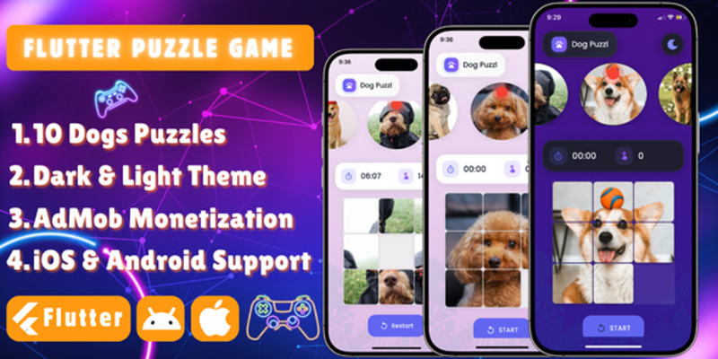Dogs Puzzle - Flutter Sliding Puzzle Game. Flutter puzzle game : 10 dog images Puzzles, AdMob ready. Complete iOS & Android source - easy to customize and reskin