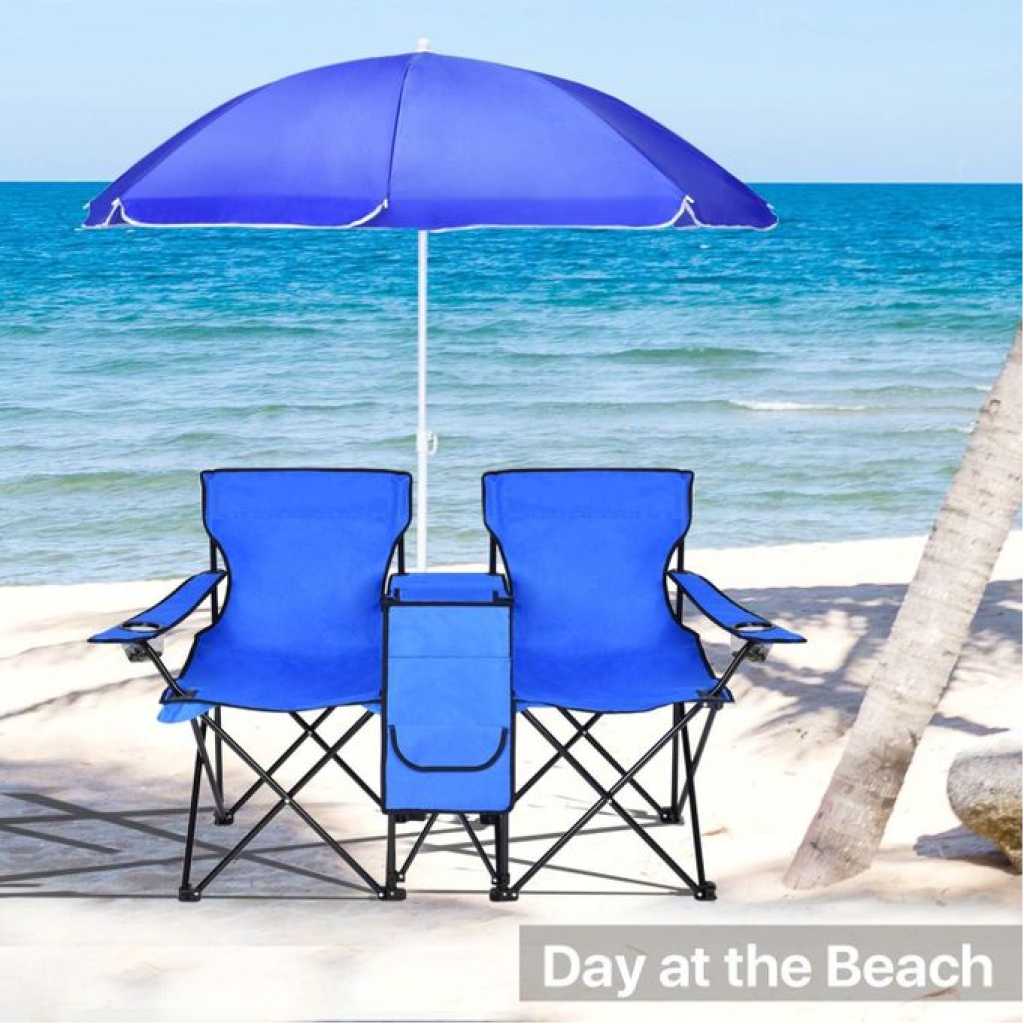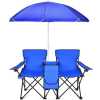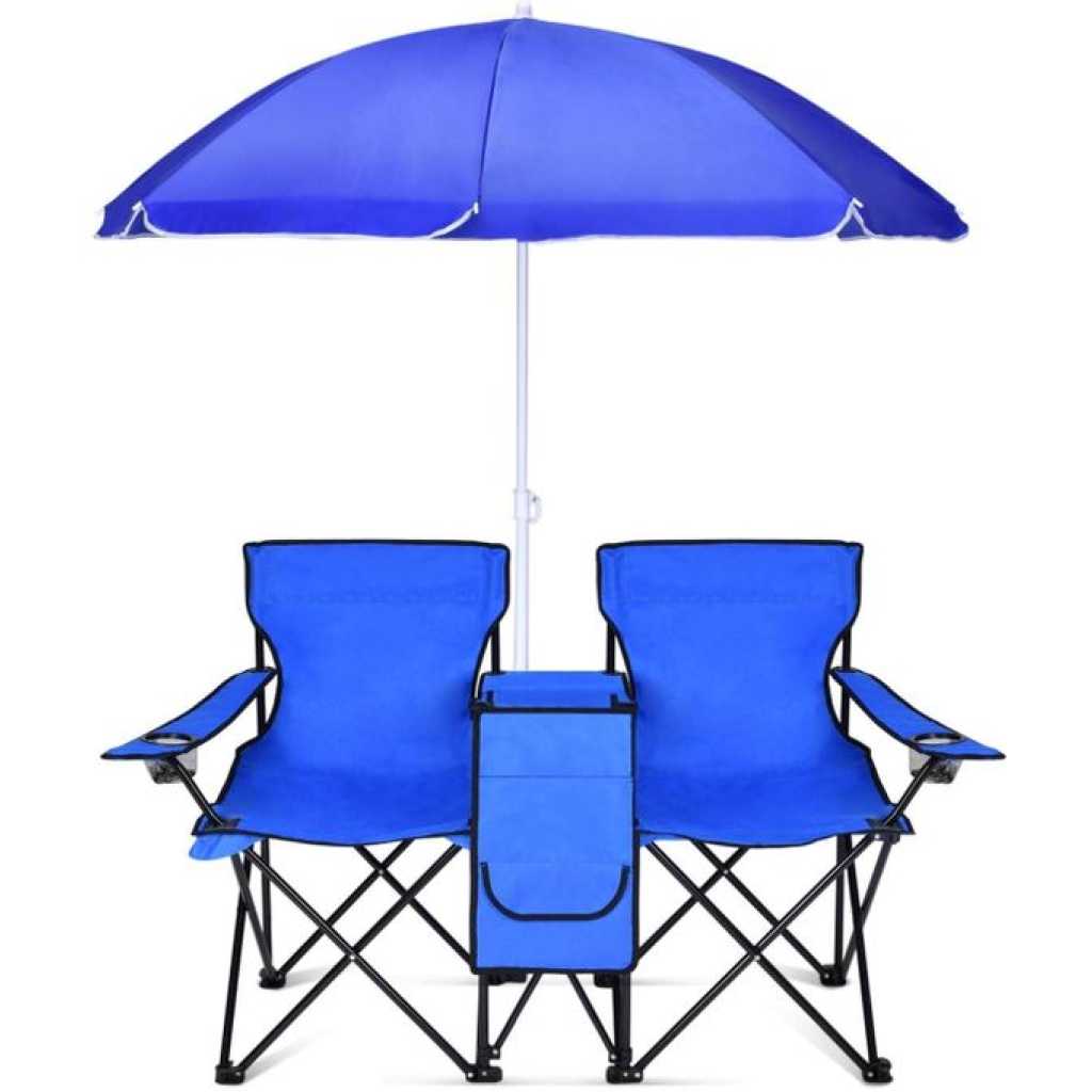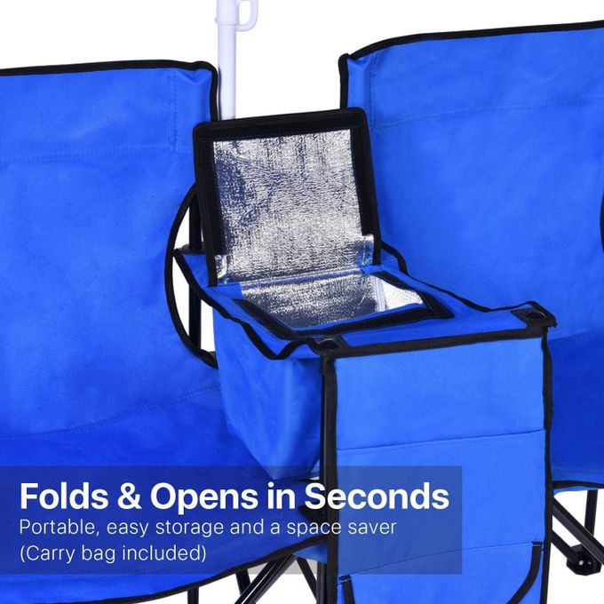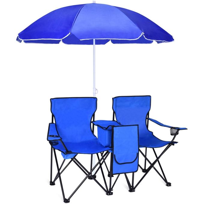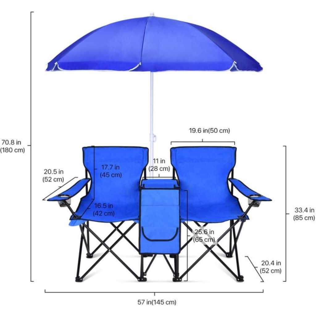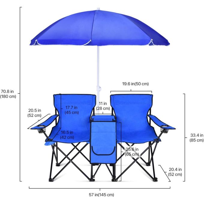 Double Folding Beach Chair with Umbrella Table Cooler and Bag, Portable Compact Folding Chair, 2 Person Camping Chair with Canopy for Adults and Kids, Outdoor Fold Up Chair, Blue Experience the perfect combination of style and comfort with our 2-Person Folding Beach Chairs for Adults. Made with high-quality materials that can withstand harsh outdoor conditions, these portable beach chairs with canopy shade will last for years. Its foldable, lightweight, and easy-to-carry design makes it easy to transport, pack, and set up in minutes! The camping chairs come with a removable umbrella that can be adjusted to any angle, providing you and your partner with some much-needed shade on hot, sunny days. The built-in cooler bag is perfect for keeping your beverages and snacks cold, while the small compartment helps you keep your phone, keys, or sunscreen close at hand. The mini table is positioned between the two seats, so you and your partner can easily share your food and drinks while enjoying each other’s company. Suitable for a wide range of outdoor activities, such as camping, picnics, and outdoor concerts, this travel chair will provide maximum relaxation under the sun. Get ready to soak up some rays and create unforgettable memories with your loved one! Specification: Material: Alloy Steel, 600D Polyester Overall seat dimensions: 20″(L) x 57″(W) x 33″(H) Umbrella: 67″ height, 60″ diameter Capacity: 250 lb each Package Content: 2x Portable Chairs for Adults and Kids 1x Removable Blue Umbrella 1x Portable Bag