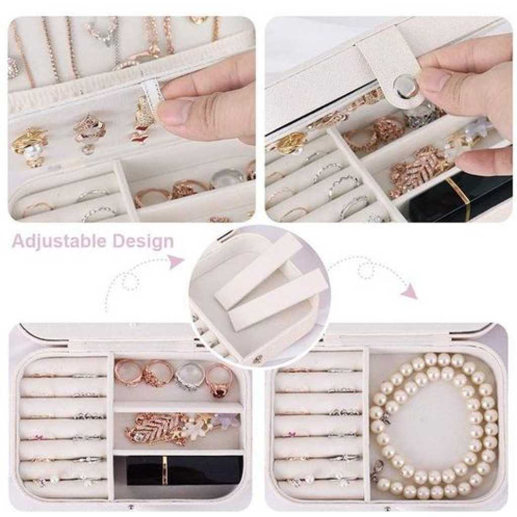 Adjustable Portable Jewelry Display Box This travel jewelry case is special for girls and women, featuring with sleek and compact design. This jewelry organizer container exterior is made of PU leather durable and sturdy, interior material adopts soft velvet lining to prevent your jewelry from scratching and colliding. Perfect gift for mother, wife, girlfriend, daughter, friends, Christmas, birthday, anniversary, Mother’s Day, Valentine’s Day. The layout inside the jewelry organizer box is double layer, the bottom part has 7 ring rolls and 3 removable compartments for necklaces, rings, bracelets, earrings, pendants, move the dividers to create the custom spacing to accommodate different sizes of jewelry. The top lid part includes 5 hooks and a lower elastic pocket to keep necklaces and bracelets, perfectly in place and not messed up. Besides, the ear stud panel in the middle part is convenient to sort the ear studs. This jewelry travel organizer has a surprising amount of storage ability and it’s a compact size to fit anywhere, especially for traveling purposes, it can be placed in the luggage, will not occupy too much space, not only everything inside is secure but also great for keeping jewelry in order and safe from getting tangled or damaged during travel. WOWparts provides professional customer service before and after your purchase. Please contact us freely if you need any further assistance. Small bag but large capacity case with double layer, provides stud plate, necklace hooks, ring groove PU leather and lined with soft bead velvet fabric, no fading, no deforming, prevent things from scratch Adjustable storage space, suitable for putting bracelets, earrings, hair accessories, watches, etc Smooth zipper closure is easy to open and close while protecting your favorite jewelry Can isolate the necklaces and other accessories placed at the bottom, perfect for women and girls Small size, portable and lightweight, easy to place inside luggage suitcase, suits for traveling Nice gift for your girlfriend, daughter, wife, on Christmas, Birthday, Anniversary, Mother’s Day, etc. Square Material: Pearlescent Cross Grain + Soft Bead Velvet Fabric Round Material: PU Leather + Soft Bead Velvet Fabric Color: White/Pink; White/Black Square Size: 6.5×4.5×2.2inches Round Size: 4.06 x 3.94 x 1.97inches Package Included: 1xJewelry Storage Box