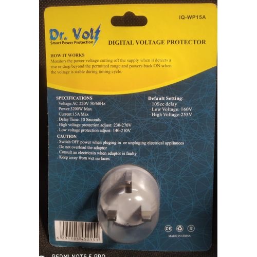 Dr. Volt Washing Machine And Printer Guard IQ-WP15A; 15 Amps, 3200W, Digital Display, 160-255V, 10sec Delay – Grey. Washing Machine Power surge protector. 15 Amps 3200W Digital Display 160-220V 10sec Delay. Affordable High Quality Durable Exclusive on TilyExpress Unbeatable prices Microprocessor based power guard, specially designed to protect washing Machine, Photo copiers, Big size Fridges and LED TVS Max load 15A ,Manual Voltage setting options, Two Years Warranty Choose from a wide range of Unique products on TilyExpress and enjoy convenient and secure online shopping, delivery, guaranteed products and competitive pricing. Grab this deal and more from TilyExpress Uganda at unbeatable prices with doorstep delivery. Key Features: Dr. Volt Washing Machine And Printer Guard IQ-WP15A; 15 Amps, 3200W, Digital Display, 160-255V, 10sec Delay – Grey. Washing Machine Power surge protector. 15 Amps 3200W Digital Display 160-220V 10sec Delay. Affordable High Quality Durable Exclusive on TilyExpress Unbeatable prices