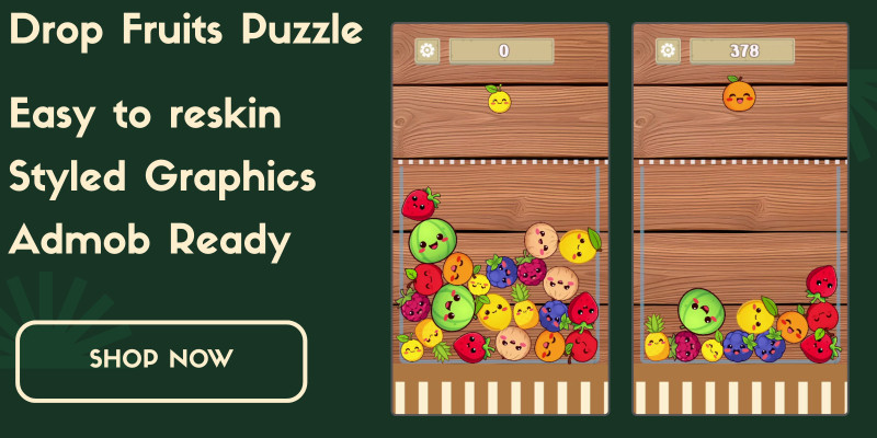 Drop Fruits Puzzle - Godot Template. Drop fruits to match them with the same type to earn points.