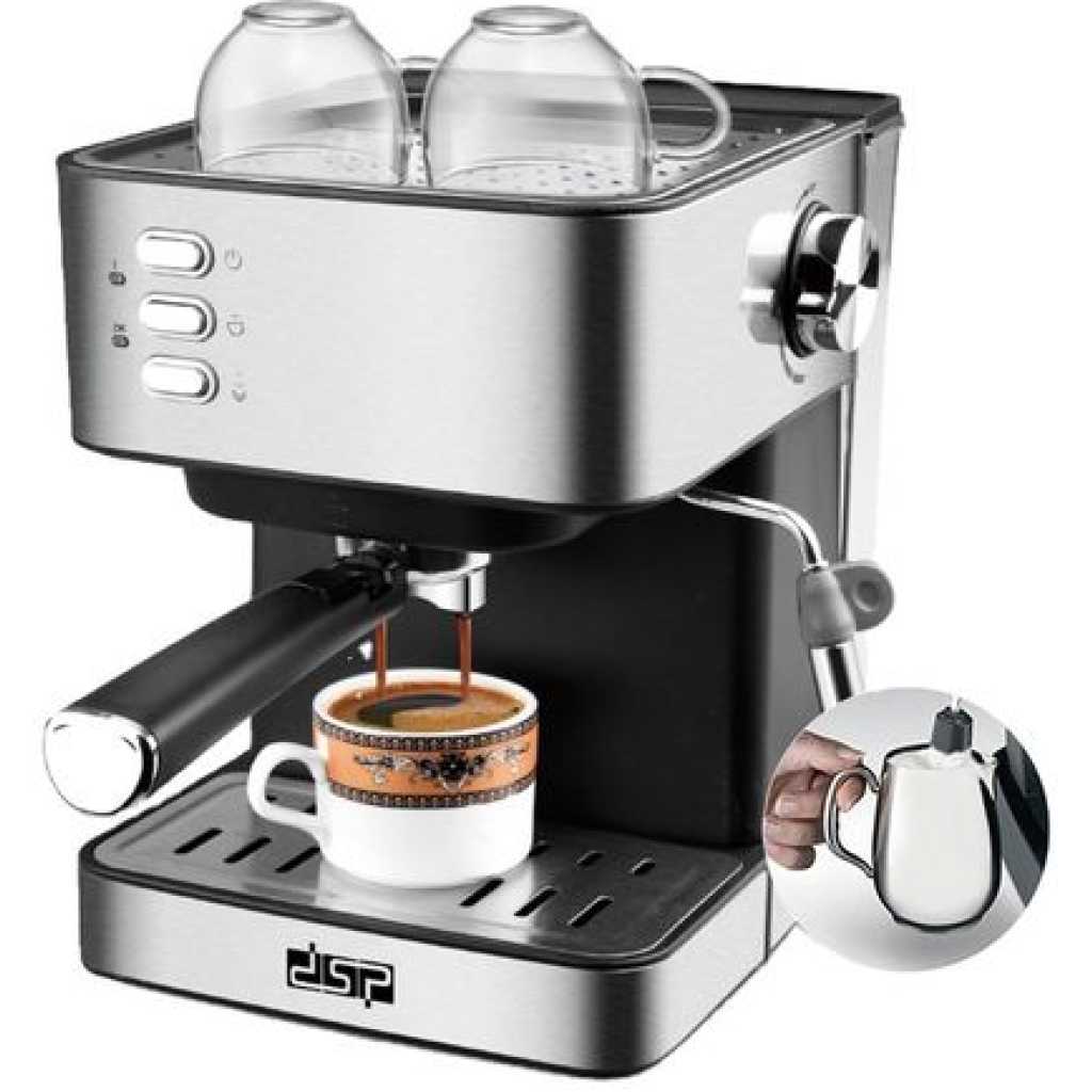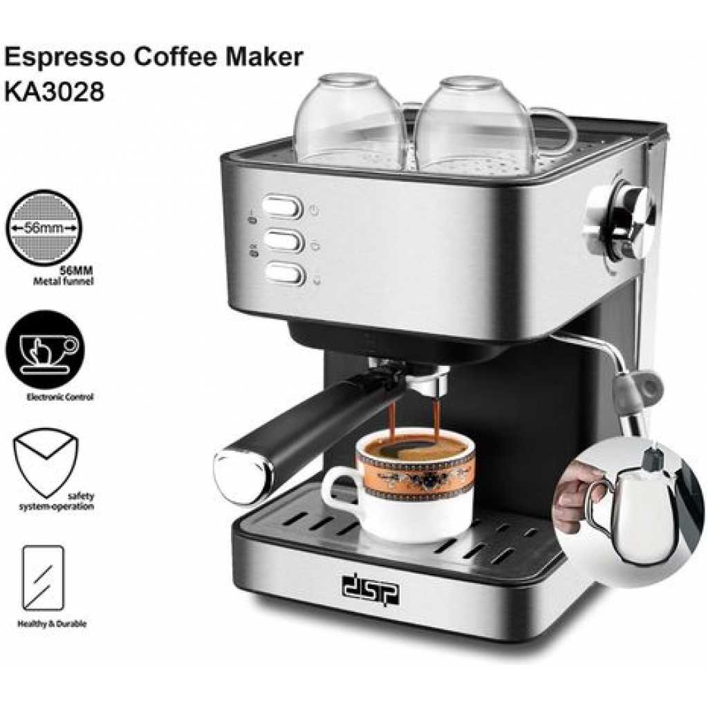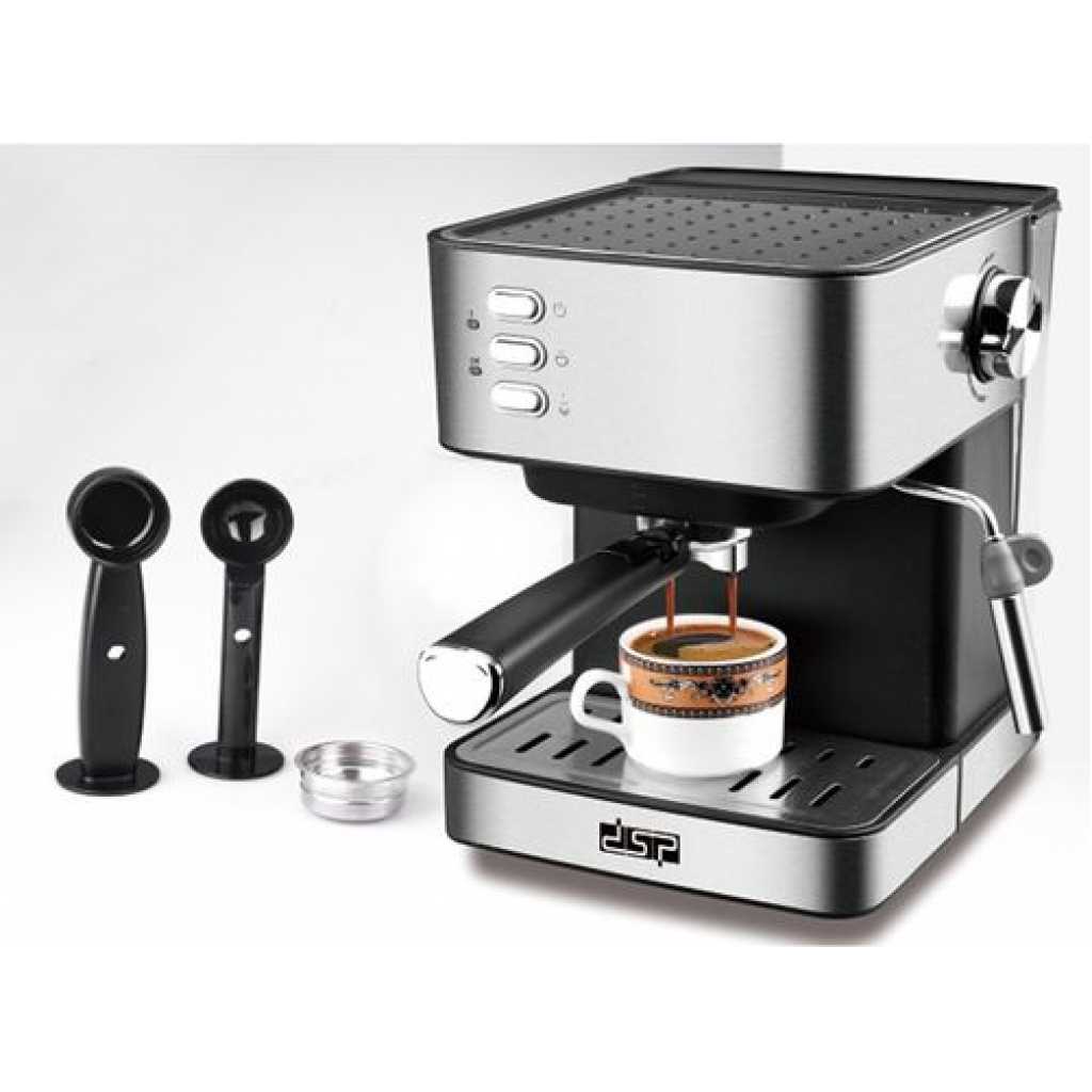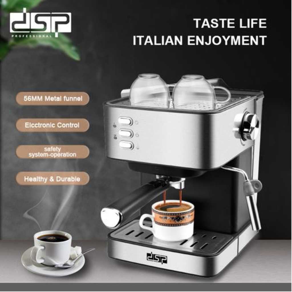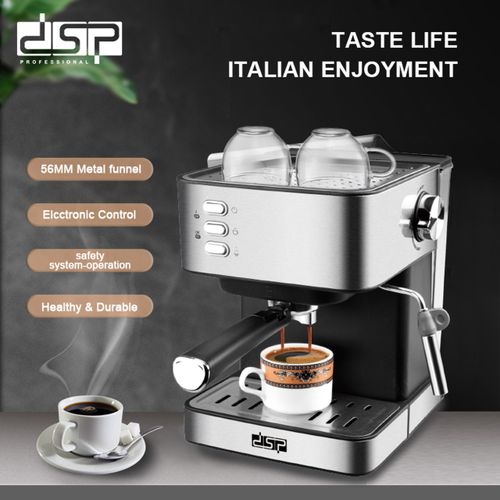 Dsp 1.6 Litre Electric Espresso Coffee Maker Machine- Silver DSP Coffee Maker prepares all types of coffee including espresso, cafe latte, and cappuccino. This all-in-one coffee maker has a steam nozzle to add froth. Make your coffee breaks more exciting with the Sonifer Coffee Maker. With its steam nozzle, you can also add froth to your coffee and make it more appealing. All the more, you can make your coffee just the way you like, be it cappuccino, espresso, or cafe latte. The coffee maker features an automatic steam pressure pump of 15 bar and a transparent removable water tank of 1.6L. The warm tray on its top keeps your coffee hot when you are preparing more than just a few cups for your guests or friends. Enjoy sipping the delicious coffee that will refresh you and keep you awake. Wattage: 1000W Capacity-10 cups 1 Glass Carafe 1 Permanent Filter Water level window on both sides of the machine Keep warm plate to keep the coffee warm Anti-drip system Eco function automatic shut-off after 40 minutes On/standby button with led Colour: Black Material: Plastic & Metal Key Features: Dsp 1.6 Litre Electric Espresso Coffee Maker Machine- Silver 15bar high-pressure pump Can make espresso and Cappuccino1.6L detachable transparent water tank With safety vale, can automatically release pressure device Die-casting aluminum alloy boiler Aluminum alloy filter holder attached with a dual-stainless filter to improve coffee quality Can make coffee with ground coffee 3 switches with indicator lights to make coffee or steam conveniently Safe and reliable, with overheating and oper pressure-protected device Detachable frothing nozzle and drip tray for easy cleaning Specifications: Voltage:220-240V~50Hz Output :850W Color: Silver Usage: Commercial Size: 215*250*288mm
