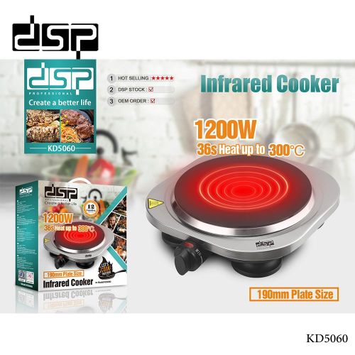 Key Features: Dsp 1 Seat Tabletop Infrared Cooker Induction Stove- Silver Adjustable thermostat control Indicator light High-efficiency temperature can be reached to 300°C within 36 seconds Rubber feet do not slip Overheat protection Material: aluminum + iron Voltage: 220-240 V Power: 1200 W Plate diameter: 19 cm Adjustable heat: 5 options