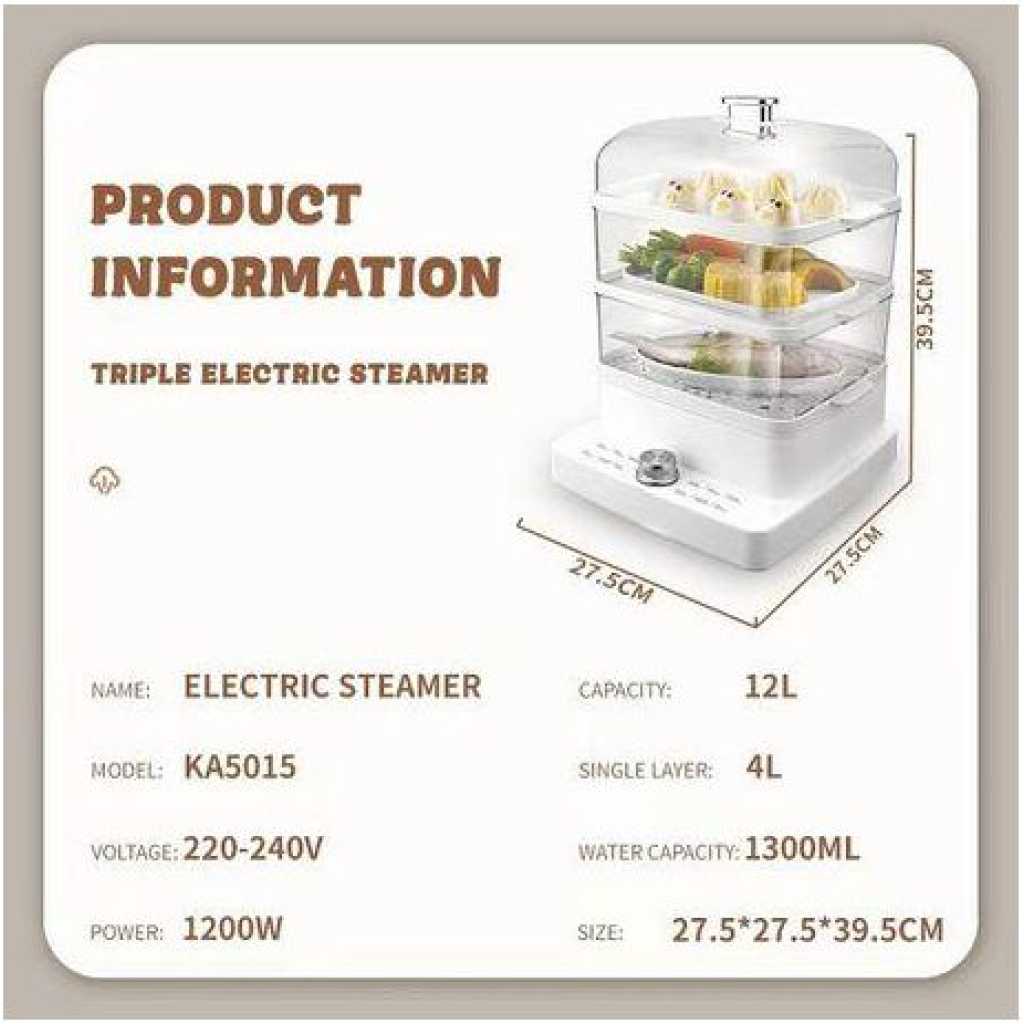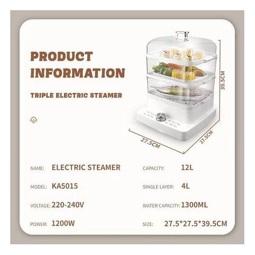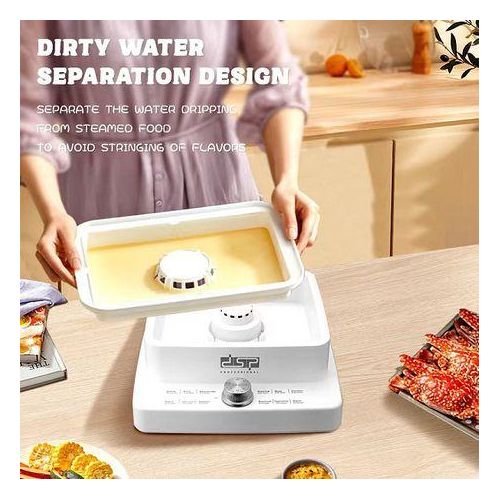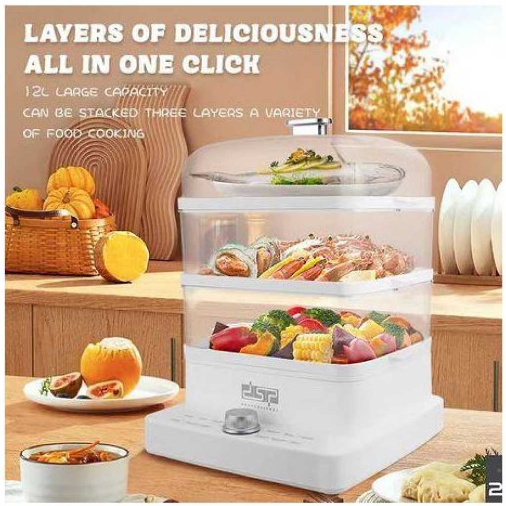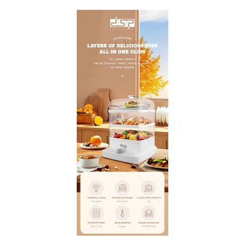 Dsp 1300ML 3 Tier Electric Vegetable Food Steamer Cooking Pot- White – The electric food steamer has a big power of 1200W along with 1300ML large water capacity for long steaming time and 3 adjustable rack layers free combinations to meet various needs as well as 30 30-second steam outlet. – Through smart innovation and intelligent design, Sunbeam aims to make everyday tasks at home simpler and easier. Whether it’s cooking, cleaning, organizing or even entertaining, this quality appliance range offers practical solutions to suit every need. Features voltage – 220 / 240V ~ 50/60Hz output – 1000 / 1200W capacity 3 layers – 4L water tank – 1300ML body materials – PA & PP – On / Off switch – 3 host layers – top / evaporate layer – second / drain pan layer – third / water tray layer Food Display grains – 30/40 min stewing – 35/45 min rice – 25/35 min meat – 30/40 min steamed cake – 20/30 min chicken – 30/40 min pasta – 10/20 min seafood – 15/25 min egg custard – 10/25 min vegetable – 10/20 min dessert – 8/12 min warm – 5/10 min What’s in the box 1x Electric Steamer 3x Rack Layers