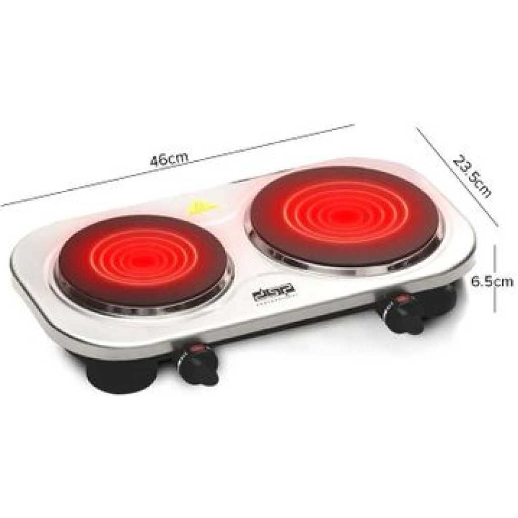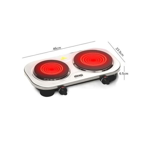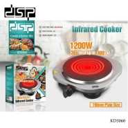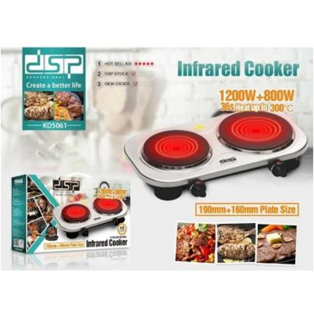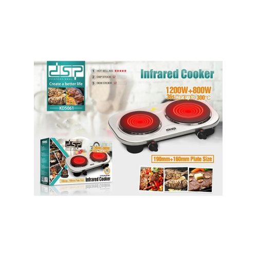 Dsp 200-800W Double Burner Electric Infrared Hot Plate Countertop Cooker Stainless Steel Panel Cooking Stove- Silver Features: High-quality stainless steel panel The electric stove warms up quickly, is very mobile, and comfortable to use Adjustable Thermostat Control: Variable Temperature Takes up very little space and weighs little, so you can use it not only at home, but also take it with you to the country, rest, and even travel Safety cut-out for no water boiling The presence of 2 burners allows you to cook 2 times more Specifications: Brand: DSP Model: KD5061 Power: 1200-800W Plate1 Size: 16.5cm Plate2 size: 19cm Input Supply: AC 220-240V 50/60Hz Size: (L23.5 x W46 x H6.5)cm Package Included: 1 x Double Burner Electric Hot Plate 1 x User Manual Key Features: Dsp 200-800W Double Burner Electric Infrared Hot Plate Countertop Cooker Stainless Steel Panel Cooking Stove- Silver High-quality stainless steel panel The electric stove warms up quickly, is very mobile, and comfortable to use Adjustable Thermostat Control: Variable Temperature Takes up very little space and weighs little, so you can use it not only at home, but also take it with you to the country, rest, and even travel Safety cut-out for no water boiling The presence of 2 burners allows you to cook 2 times more