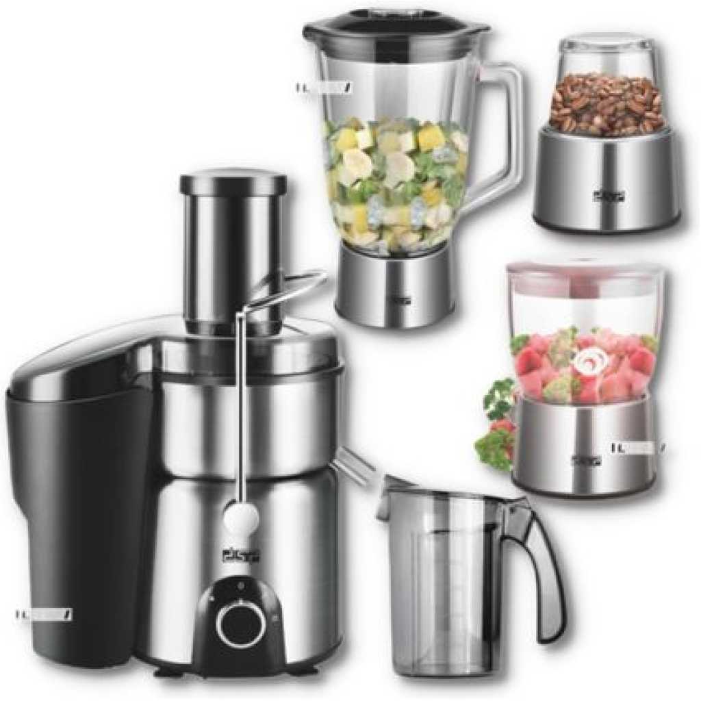 Key Features: LED switch Voltage: 220-240V 50/60H 2.0L pomace bucket; 1.0L juice cup 4 in 1: Juicer, Blender, Meat chopper and Grinde 1.5L glass blending cup,600MLfood chopper; Overheat protection & safety lock device Stainless steel blade assembly. 15.5cm EXTRA stainless steel filter basket. Full stainless steel housing. Transparent lid and non-slip rubber feet. 75mm diameter of feeding tube available for juicing whole carrot, apple, pear etc. 8820 full copper motor Output: 800W
