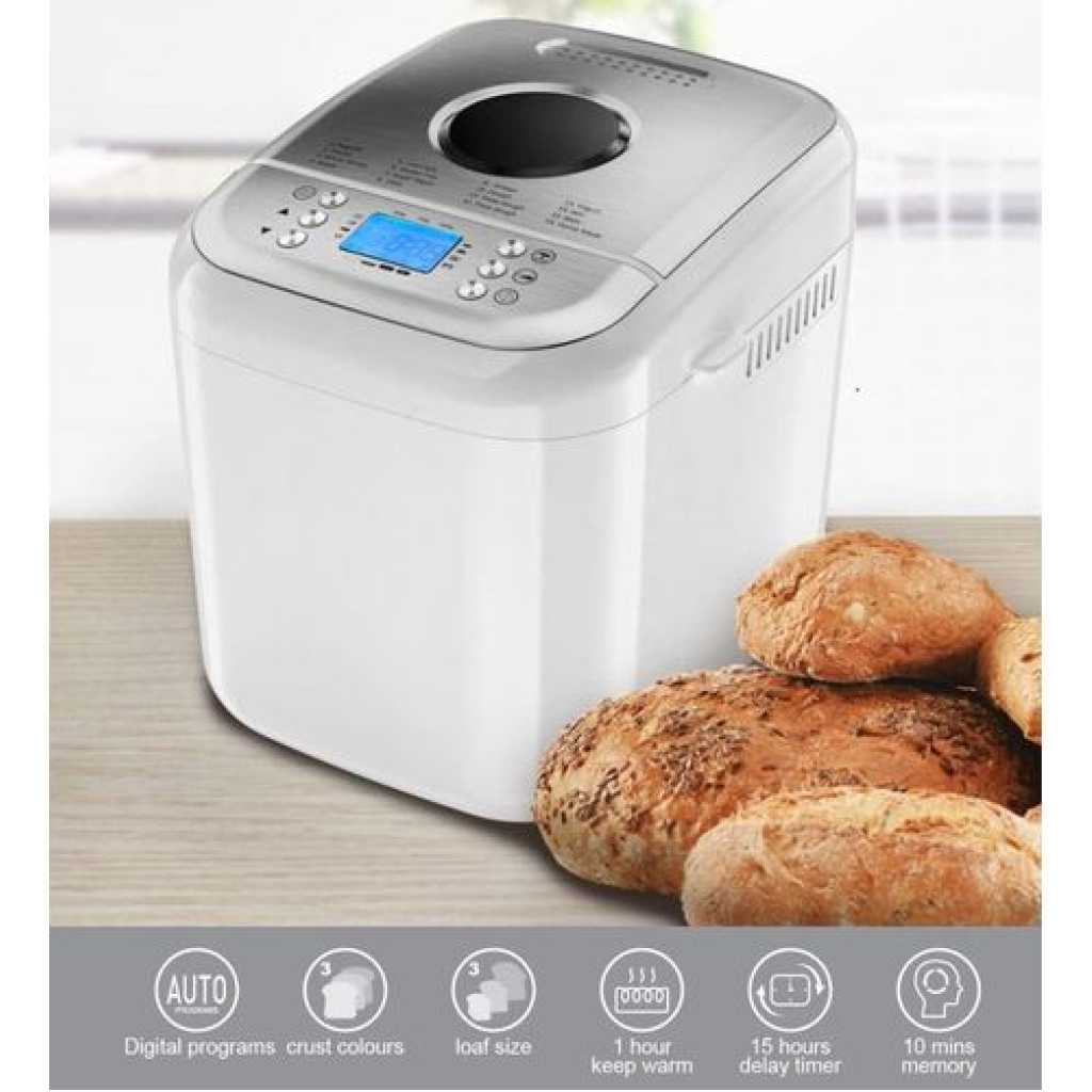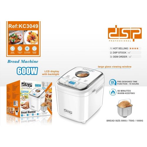 About this item Product dimensions: 33 x 27 x 29 cm. Bread maker made of PP plastic and brushed stainless steel. 6 button electronic control: menu, color, +/-, miche, on/off. Power 600 W (500 W heating element and 100 W AC motor). Voltage: 220-240V/50Hz Weight: 11 kg. 3 weight settings to make 500g, 750g or 1000g breads. You can choose the colour according to 3 levels of browning: light, medium or well cooked. Home-made bread and chopsticks to satisfy the wishes of the whole family with the BAKER digital screen bread maker. Even kneading Aluminium blade. 19 possible programs with this bread maker: basic, baguette, full bread, white bread, fast, sweet bread, gluten-free, dough, jam, cake, sandwich, specialty, baking, homemade yogurt, kneading etc. Removable non-stick pan for easy release of bread BAKER bread machine, dishwasher safe.