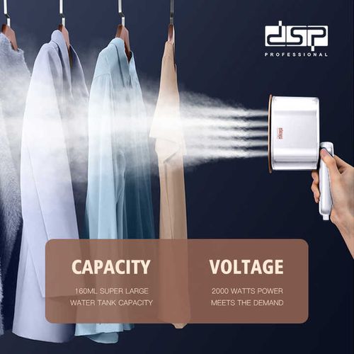 Dsp Portable Micro Handheld Cloth Garment Steamer Iron Machine- White. This vertical steamer is a multi-functional household appliance that will find its use not only at home but also in clothing stores, dry cleaners, curtain, and curtain salons, etc. In addition to ironing the material, you can also disinfect clothes thanks to powerful steam transfer. Powerful, mobile, and stylish! 2 steam levels.Water tank capacity 320mlSteam start-up time 45s.Strong continuous steam, steam up to 35g / min. Safe on all garments indicator light. You can use it easily when standing/sitting. 1. PRESSURIZED COMPACT TECHNOLOGY: Professional garment steamer has stainless steel steam panel and 14 holes to create concentrated steam. 2. CONSTANT STEAM FUNCTION: The mini steamer use the lock button for continuous steam, 280ml water tank allows this clothes steamer to generate steam for over 15 minutes at a time 3. EXTREMELY EASY USE: The garment steamer can be used both vertically and horizontally with perfect anti-leakage and anti-water designed, water receptacle removable safe for a variety of fabrics including cotton, wool, polyester, plush, silk, fiber, nylon, velvet, and linen 4. AUTOMATIC SHUT-OFF: Automatic shut-off works when burning with low-water and 8-minute inactivity, electric leakage, and over-heating protection. Drops of the water tank were left by testing, please do not mind. Package included: 1X Garment Steamer