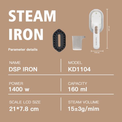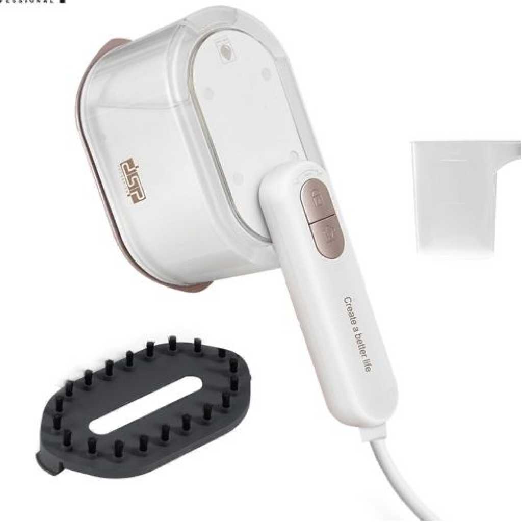 Key Features: Dsp Portable Micro Handheld Cloth Garment Steamer Iron Machine- White. Powerful& Continuous Steam: 160ml Visual Water Tank to help you clearly observe the water level and easy to add water in time. Plugged in and ready to use, it only takes the 30s to finish heating. The internal double-flow steam technology makes the steam strong and dense with a continuous steam volume of up to 15g/min. The dense dry steam can make the clothes flat immediately, but it won’t make clothes wet. Multi-Function: Our steam iron can both hang and flat iron, and has both dry ironing and wet ironing modes, which can be applied to various fabrics. The soleplate is coated with a ceramic glaze for smooth use and no damage to your clothes. Rich Accessories: Equipped with an insulated base, you can easily place the iron after heating to avoid burns. With a removable brush to brush away dirt and smooth out lint on clothes. A water cup makes it convenient for you to fill the iron with water before use. Portable & Practical: Our steam iron features a rounded design and hidden water tank which make it beautiful, compact, and practical. The handle folds 180° and comes with a storage bag for easy storage. Weighing only 1.5 pounds, the steam iron is a good choice for home or travel and business. Circular arc design, no dead angle in ironing. Safe To Use: Our steam irons are double protected with smart temperature control and fuses so you can use them with peace of mind. A simple one-touch start design makes operation more convenient. If you have any problems with use, please contact us, we will do our best to help you.