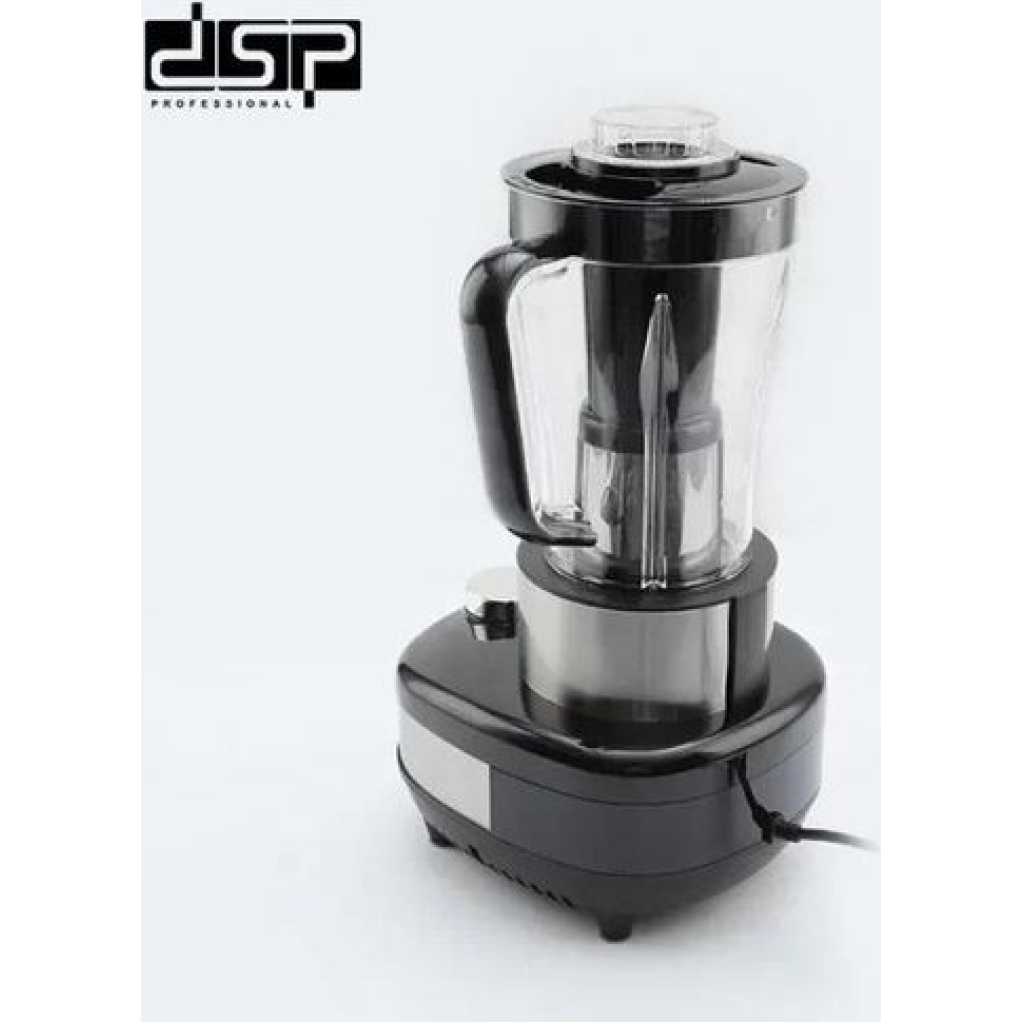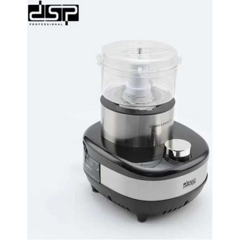 4-in-1 800W PC Plastic Multi-Function Unbreakable Pc Jar Food Processor KJ2177 Combats the kitchen chaos that occurs when chopping, mixing, juicing, and grinding any ingredients that you need The food processor is the dream of every housewife, its functional and reliable A versatile kitchen appliance that can quickly and easily chop, slice, shred, grind, and puree almost any food 6 blades to help mince, chop and grind in the most perfect way Key Features: DSP Powerful Commercial Food Processor With Juicer, Blender And Grinder KJ2177. Model: KJ2177 Brand: DSP Output: 800w 304 Stainless steel 6-blade steel knife Overheating protection 2 speeds with pulse function Material: Pure Copper Motor + Stainless Steel Knife + PC Plastic Mincer: 650ml (PC Plastic) Juice Cup: 1.8L (PC Plastic) Grinding Cup: 450ml (PC Plastic) Waterproof motor Unbreakable PC JAR