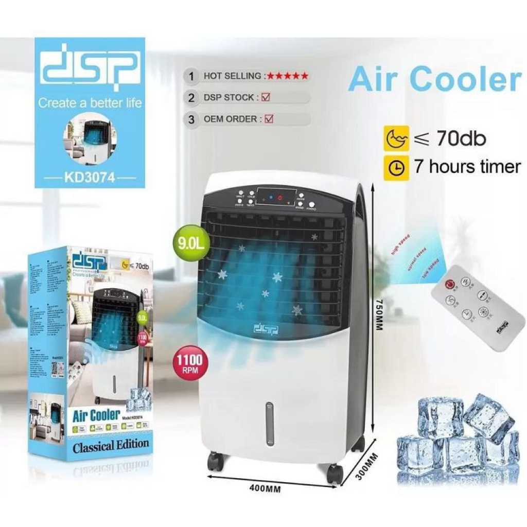 Small Portable Air Cooler with Remote and 9L Water Tank Dsp Professional KD-3074 Air Cooler combines elegant design with powerful cooling capabilities. With the remote control device, you can easily adjust the settings from anywhere in the room. The cooler features a large water tank capacity and multiple speeds to provide comfortable and effective cooling for medium to large spaces. Features of Small Portable Air Cooler with Remote and 9L Water Tank Dsp Professional KD-3074 Air Cooler: Beat the heat with the DSP air cooler equipped with a remote control device. With its stylish design and powerful cooling capabilities, it is perfect for any room in your home or office. Thanks to the included remote control device, you can easily operate it from anywhere in the room, allowing you to adjust the settings without the need to move. It comes with immense cooling capacity suitable for medium to large-sized rooms, providing cool and refreshing air that makes you feel comfortable and revitalized. With a power capacity of 65 watts, it ensures strong and efficient performance in energy consumption. Three-speed levels, allowing you to choose the appropriate speed for your needs. With an operating frequency ranging from 50-60 Hz, it ensures stable and sustainable performance. With a water tank capacity of up to 9 liters, it provides continuous cooling for long periods without the need for frequent refills. With a rotation speed of up to 1100 revolutions per minute and an air flow speed of 8 meters per second, this provides quick and efficient cooling. With an air flow capacity of up to 500 cubic meters per hour, it ensures optimal distribution of cool air throughout the room. Dimensions of 23 * 38 * 72 cm make it easy to place anywhere without taking up much space. Key Features: Beat the heat with the DSP air cooler equipped with a remote control device. With its stylish design and powerful cooling capabilities, it is perfect for any room in your home or office. Thanks to the included remote control device, you can easily operate it from anywhere in the room, allowing you to adjust the settings without the need to move. It comes with immense cooling capacity suitable for medium to large-sized rooms, providing cool and refreshing air that makes you feel comfortable and revitalized. With a power capacity of 65 watts, it ensures strong and efficient performance in energy consumption. Three-speed levels, allowing you to choose the appropriate speed for your needs. With an operating frequency ranging from 50-60 Hz, it ensures stable and sustainable performance. With a water tank capacity of up to 9 liters, it provides continuous cooling for long periods without the need for frequent refills. With a rotation speed of up to 1100 revolutions per minute and an air flow speed of 8 meters per second, this provides quick and efficient cooling. With an air flow capacity of up to 500 cubic meters per hour, it ensures optimal distribution of cool air throughout the room. Dimensions of 23 * 38 * 72 cm make it easy to place anywhere without taking up much space.