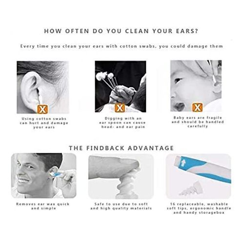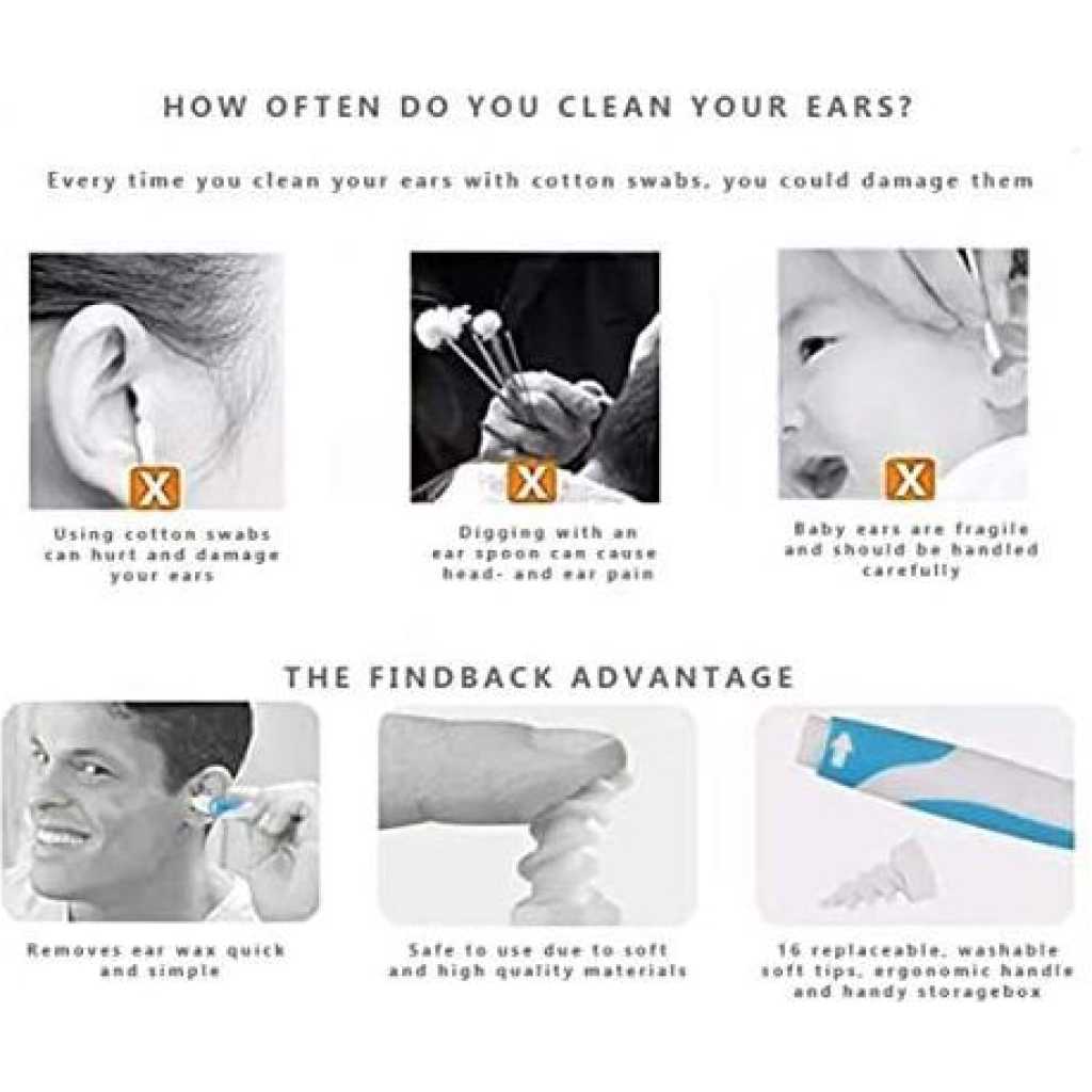 Key Features: EASY * Place in ear and twist. HYGIENIC * Easy to rinse. SAFE * By using high-quality, non-toxic, flexible material completely safe, even with babies. EFFICIENT * With it’s unique spiral shape, it removes earwax efficiently and quick. Doesn’t push the earwax further in the ear like other products. Stop buying cotton swabs over and over again. COMPLETE Comes complete with 16 washable tips, ergonomic handle and handy storage box.