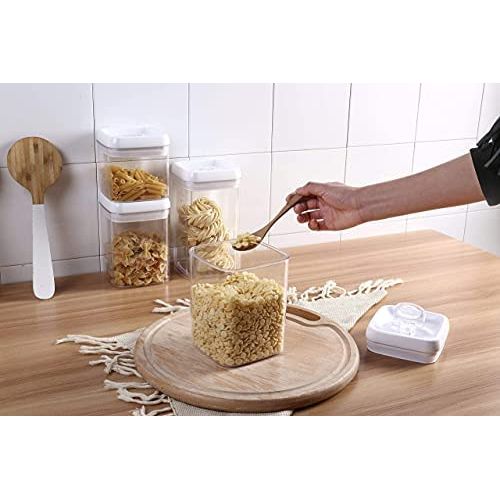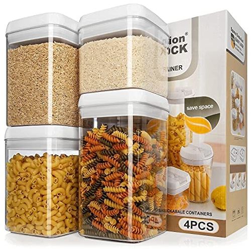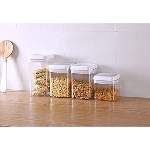 Key Features: Easy Lock Square Airtight Kitchen Storage Containers 4pc Plastic Canisters With Vacuum Seal Lids- Clear EASY LOCK food storage container is useful for flour, sugar, pet food, cereals, rice, spaghetti, spices, and cheese dispensers; also great for pantry storage organization, kitchen, garage, sewing room, playroom, and in restaurants to keep FOOD SAFE & DRY STORE MORE VOLUME (6.7Qt) AND SAVE SPACE WITH 4 CANISTERS in your pantry with stackable or modular airtight kitchen and food storage containers for better kitchen organization and storage. BIGGER CONTAINERS THAN COMPETITION – Do not be deceived by the number of canisters or storage containers on offer by our competition. Your order comes with the largest set available in the market. With a full range of sizes in large, medium, and small canisters (One Large set of 2.3Qt or 11 Cups, Two Medium sets of 1.7Qt and One Small set of 1.0Qts or 5.3Cups) and silicon rings on lids shuts out air and moisture Made from clear BPA free plastic container with AIRTIGHT and WATER TIGHT seal lids to prevent sogginess and food going stale VERY EASY to lock and open, SHATTERPROOF flip flop dry STORAGE SYSTEM for even dog and pet food.