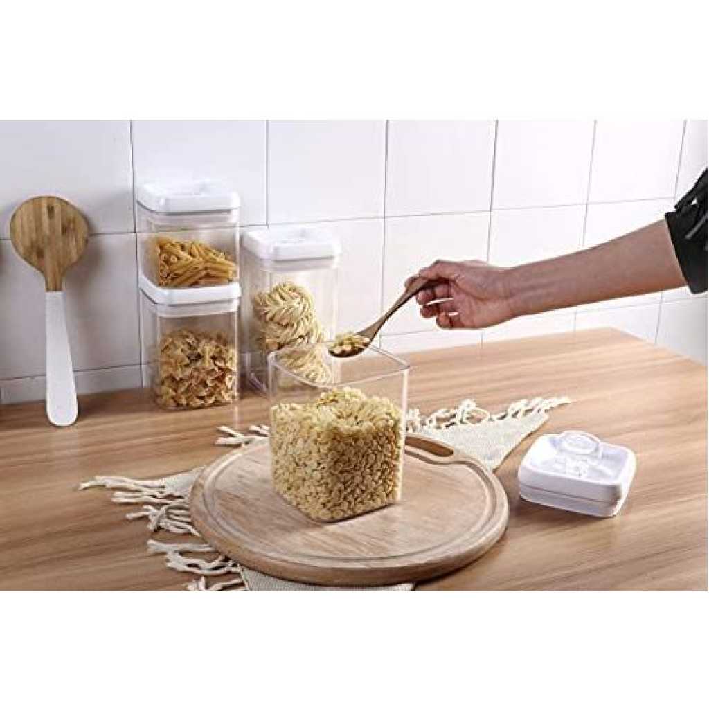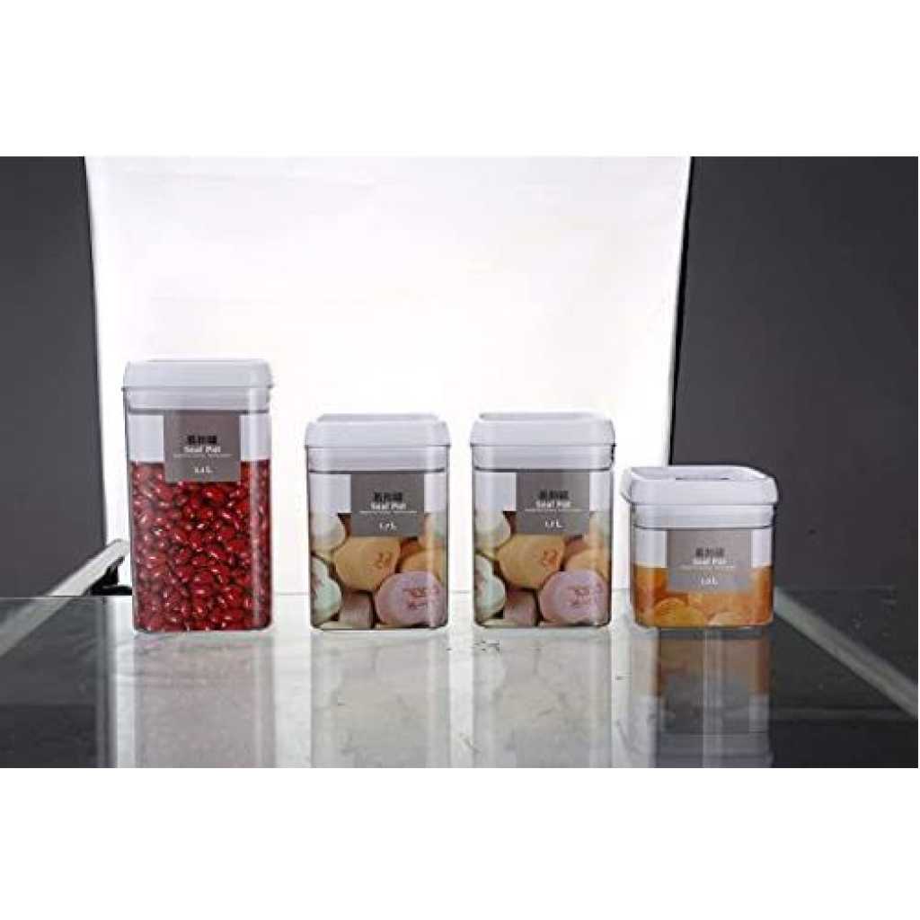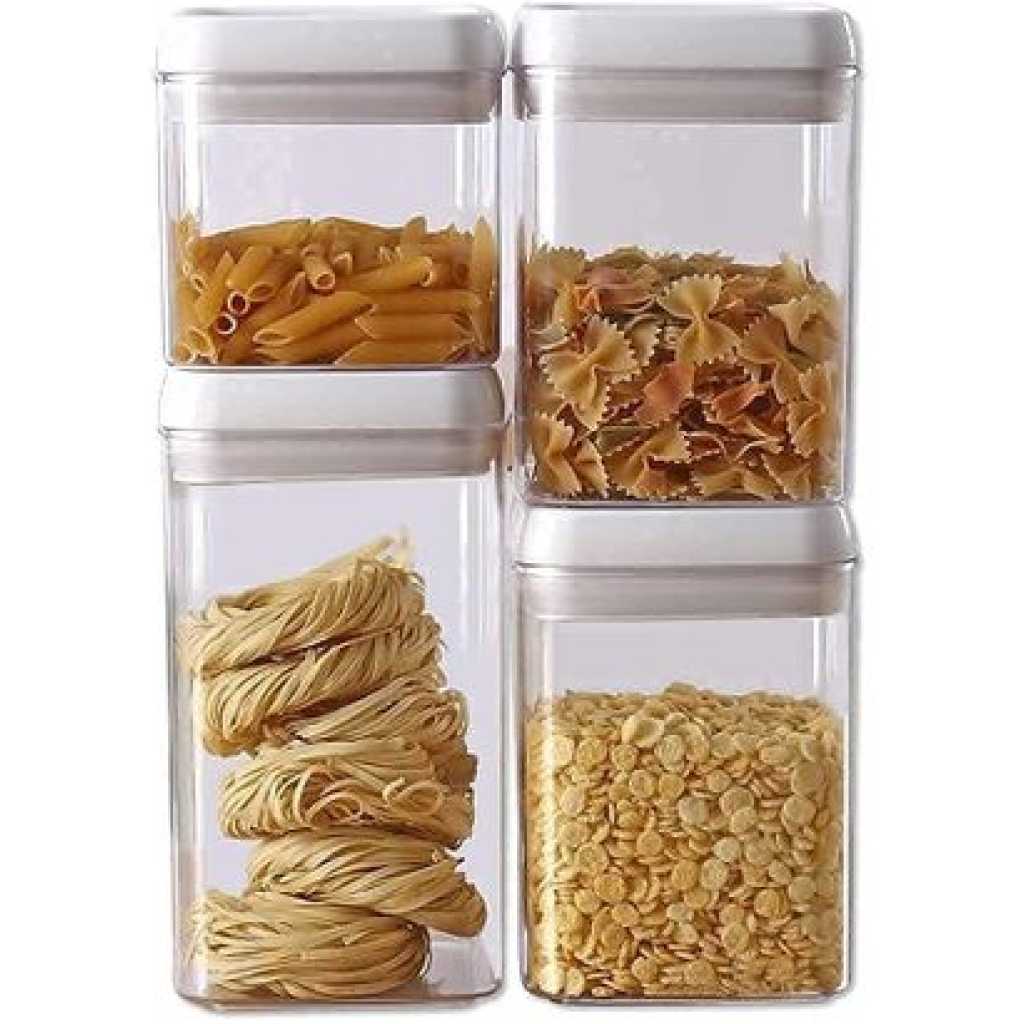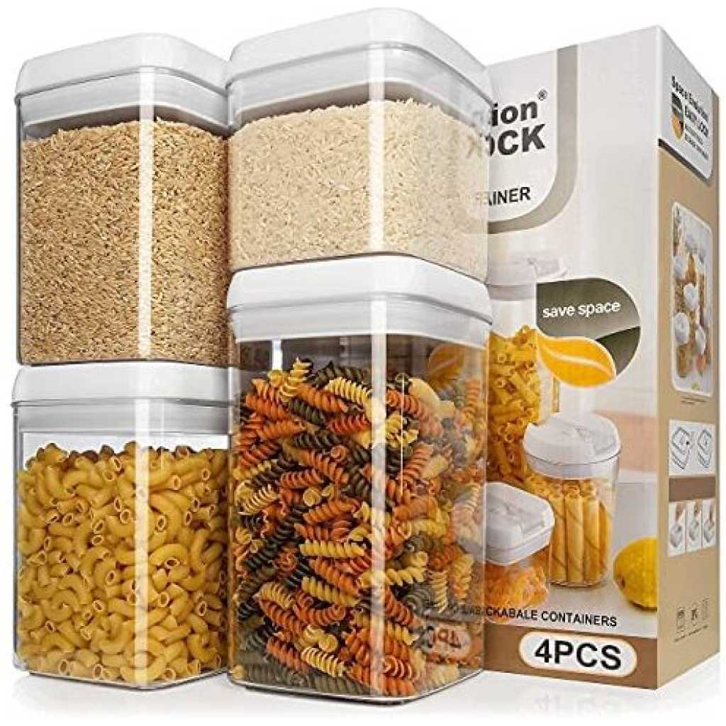 Easy Lock Square Airtight Kitchen Storage Containers 4pc Plastic Canisters With Vacuum Seal Lids- Clear Easy Lock Airtight Kitchen Storage Containers 4pc Set Plastic Canisters With Vacuum Seal Lids Discover the Best Way to Store Your Pantry Items and Ingredients Neatly Are you tired of finding bugs in your Pantry Jars and Canisters? Do your pantry or kitchen ingredients often go soggy with moisture? Is keeping your food package airtight or sealed a harrowing experience anytime you open a new spice or flavor ingredient? Would you like a better organized pantry and kitchen with well-arranged items even with limited space? If you are like most people here now, your answer would be Yes. And you need a solution to your pantry problems… So, look no further… Let me introduce to you, the best dry food storage system now! It is the Easy Lock Airtight Plastic Food Saver. Easy Lock Food Container is the best way to preserve and store grains, flour, sugar, cheese, and milk. cereals, nuts, fruits, beverages, coffee beans, and many more pantry items. The plastic airtight rectangle-shaped food container saves you space. It’s stackable waterproof containers ensure you organize your pantry better. Easy Lock comes in an airtight sealed lid with a silicon ring designed to shut out air and moisture keeping food dry and fresh. Its flip-flop seal pot design makes it easy to open and lock even with only two fingers. Handle is easily removable guaranteeing an easy wash experience.