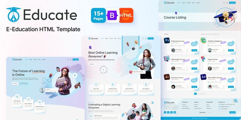 Educate - Online Education Courses HTML Template. Education HTML template for schools, university, LMS and online courses. Responsive, Bootstrap, SEO-friendly, clean code.