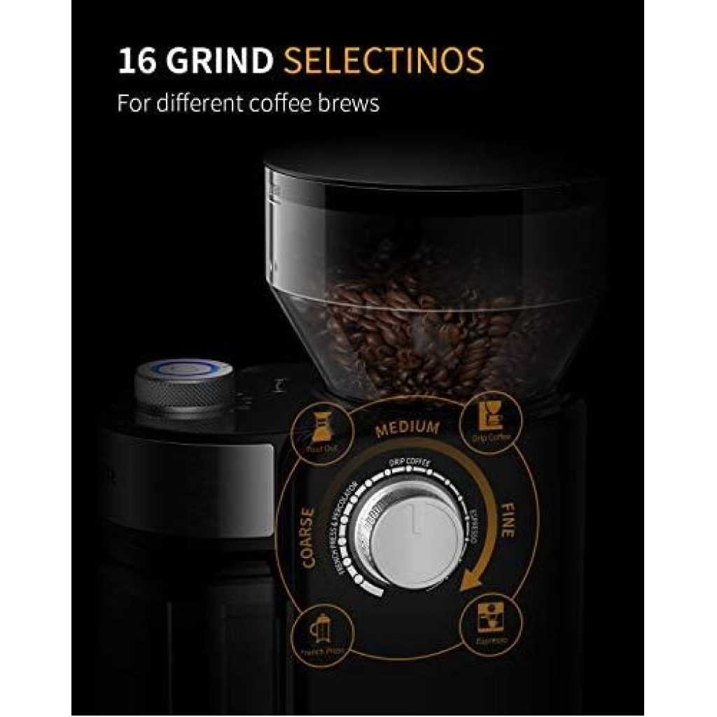 Electric Coffee Grinder 2.0, Adjustable Burr Mill with 16 Precise Grind Settings for 2-14 Cups. The main products include a burr coffee grinder, drip coffee maker, hand mixer, electric blade coffee grinder, and kettle. will be committed to kitchen small appliances and will develop and launch durable cooking tools constantly. 16 Grinding Settings Burr Coffee Grinder It uses a metal burr system to grind beans. You can choose from 16 grinding settings, which can be used for different brewing methods. And you can also choose from 2-14 cups. Grind It Your Way Choose from 16 precision grinding settings. Adjust the settings of the grind before adding coffee beans. Burr Grinder System The burr grinding system can avoid overheating of coffee beans, retain the flavor and fragrance of coffee beans, and obtain better taste. Grinding Chamber Removable for easy cleaning and take-out ground coffee. Select Your Preferred Cups The number scale control dial is from 2 to 14 cups to grind the amount you need. One Button Switch Automatic stop at the end of grinding. Wire Can Be Stored It saves the kitchen space and keeps it clean and tidy. Key Features: Electric Coffee Grinder 2.0, Adjustable Burr Mill with 16 Precise Grind Settings for 2-14 Cups. Uniform Coffee Grounds: Metallic flat burr coffee grinder avoids overheating the coffee beans for the full coffee flavor. Customizable Grind: With 16 grinding settings from fine for pour-over to coarse for french press. Grind on Demand: 2-14 cups quantity selection settings to grind the exact quantity you need for a single cup or a large gathering. Easy to Clean: Removable upper burr, hopper, chamber, included brush for easy clean them. What You Get: coffee grinder, 2 in 1 spoon (brush and spoon), Manual booklet. If you have any questions about our products, we will reply within 24 hours.