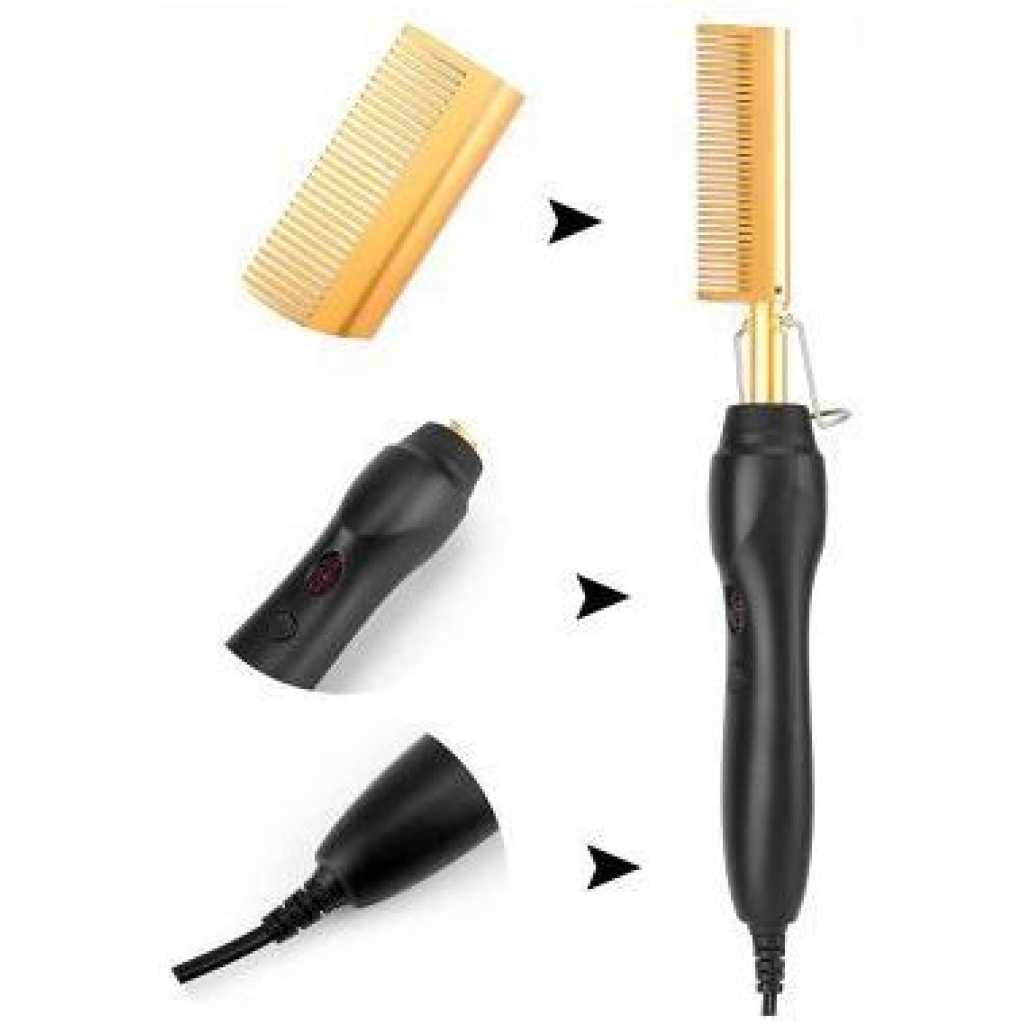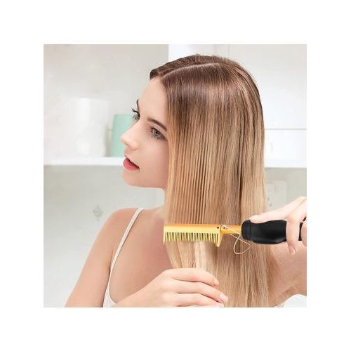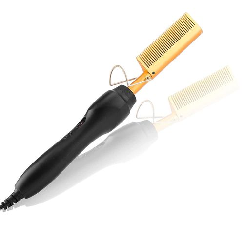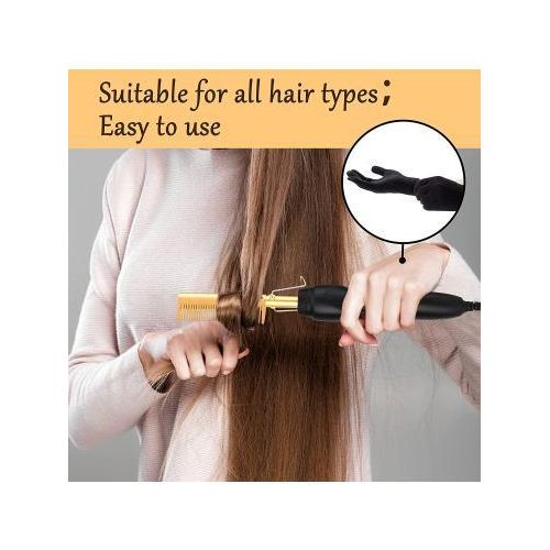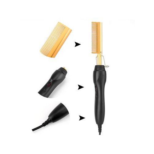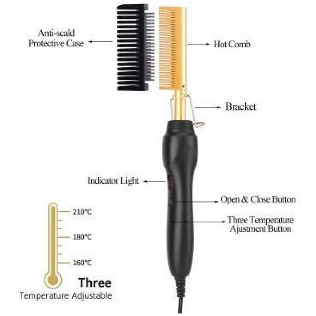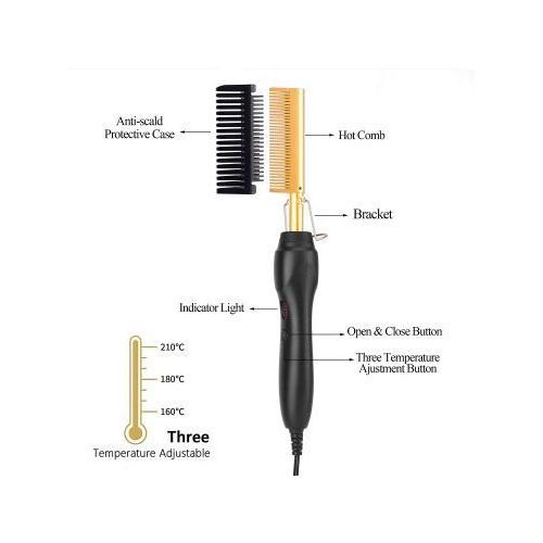 Electric Hot Comb Hair Straightener, High Heat Adjustable Temperature Iron Comb Straightening or Curly Hair – Pressing Combs for Natural Black Hair African American Hair & Wigs Electric Hot Comb Helps To Make The Hair Soft And Shiny. 1. Using ceramic technology, the electric comb can provide even heat, keep hair shiny, and do not produce frizz when straightening the hair. 2.2 in 1 Functions: not only can curly hair, but also straight hair. High-performance ALL-IN-ONE. 3. Auto-off safety feature, One-button operation design, easy to use.. 4. Suitable for all hair types: Long, short, damaged, colored, or hair extensions. 5. Lonic technology, less heat-related damage and keep hair shiny, smooth, shiny finish. Electric Hot Comb Makes your hair soft, smooth, elegant, beautiful, and shiny. Easy To Use This compact and simple straight electric hot comb comes with a 360-degree rotating power cord that prevents tangling which helps you operate with all your convenience. Usage by different temperatures follows the hair condition Gear adjustment: three gears (high, medium, low) High-end: 180~210? suitable for thick and hard hair Mid-range: 160~180? suitable for normal hair Low grade: 80~160? suitable for soft hair Titanium Alloy The heated combs provide even heat, do not harm hair, and help you make the hair bright & beautiful. Titanium Alloy The heated combs provide even heat, do not harm hair, and help you make hair bright & beautiful. Easy To Operate Simple design with On & Off switch buttons, clear to see, easy to operate. Here are 3 temperature controls, adjust the temperature. number. Heat-up Quickly The hot comb is heated quickly, and you can heat to the set temperature in just 20-30 seconds which can quickly reach the ideal temperature and greatly save modeling time.