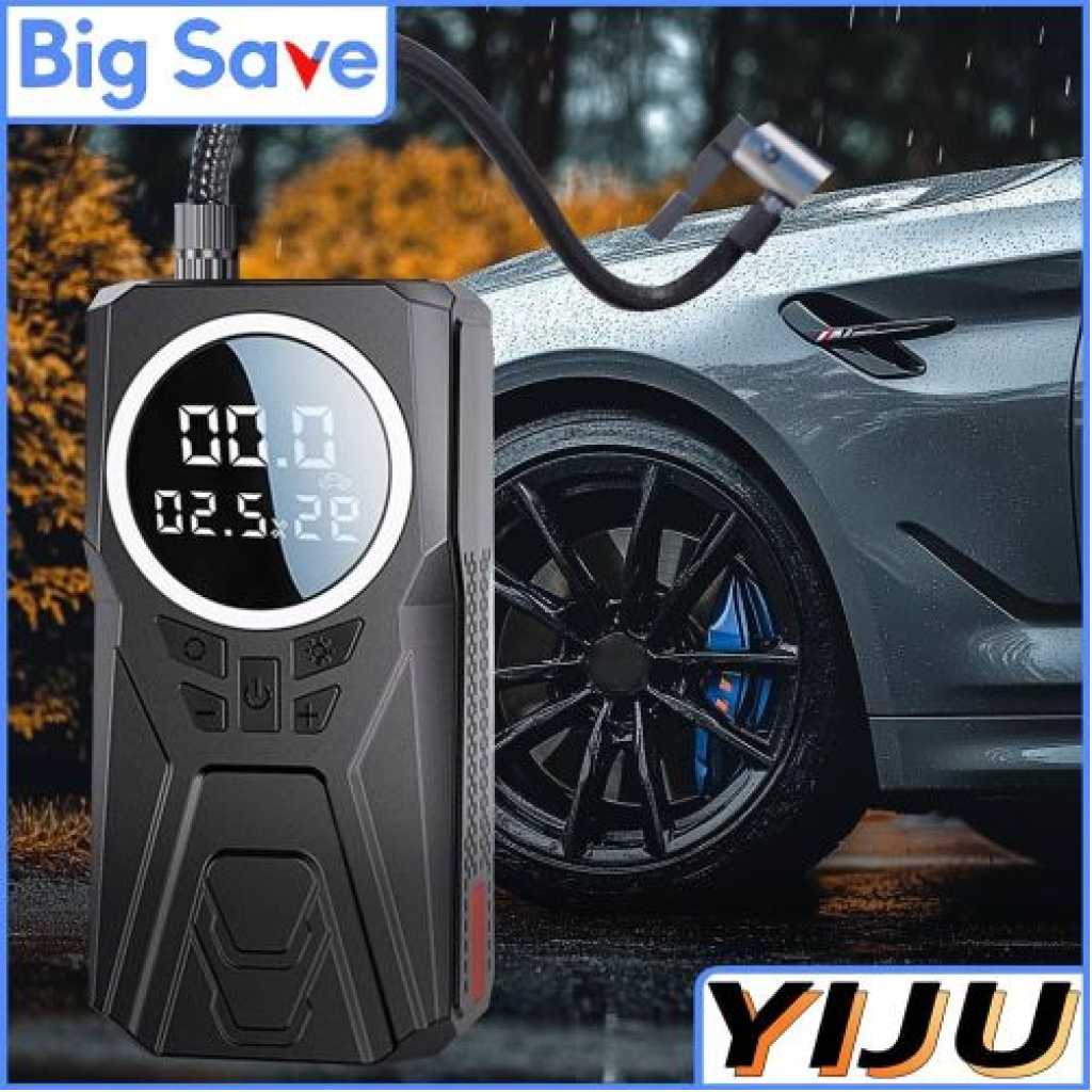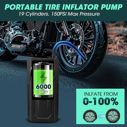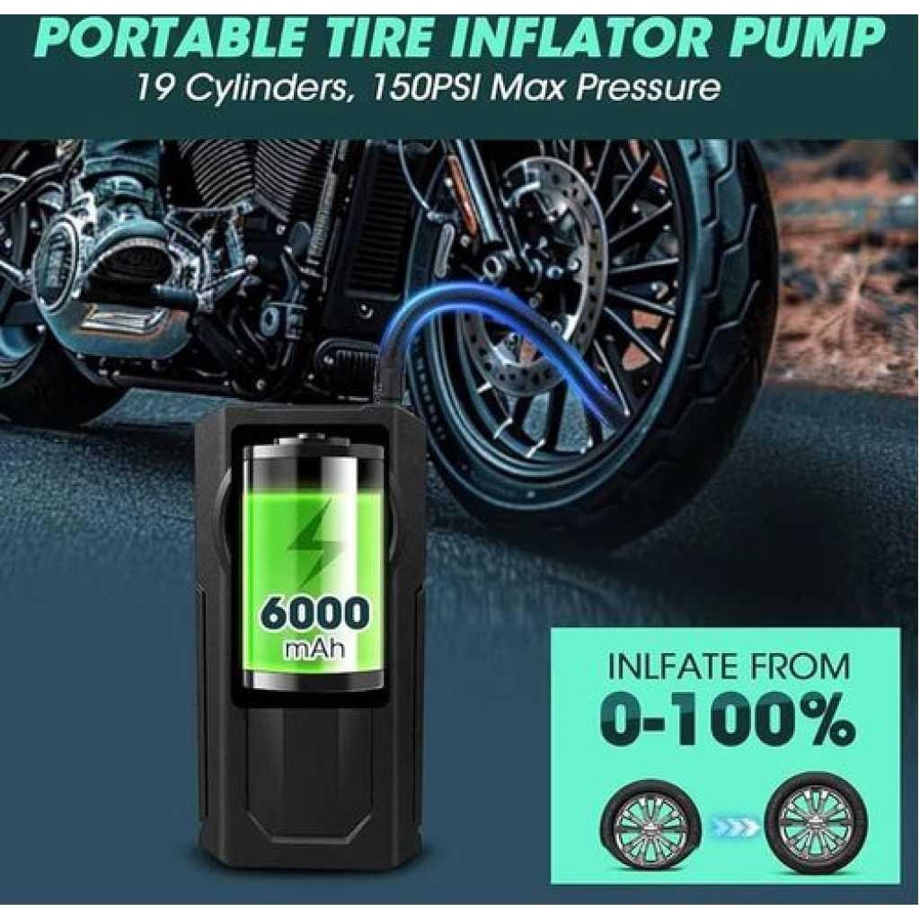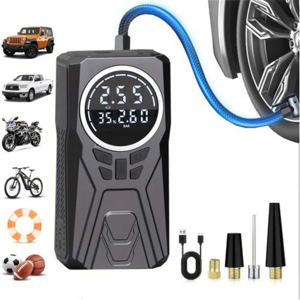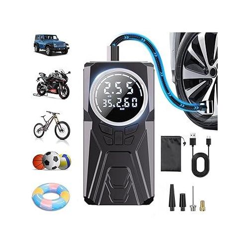 ????TIRE INFLATOR PORTABLE AIR COMPRESSOR – Equipped with a high-efficiency motor to allow for fast and efficient inflation, the 12V rechargeable battery air pump provides a maximum pressure of 150 PSI and airflow of 45L/Min, filling up the whole car tire within a few minutes. Perfect for inflating cars, motorcycles, bikes, balls, and other inflatables. ????️DUAL POWER SUPPLY – Built-in 6000mAh rechargeable larger capacity battery, letting it quickly cordless inflate up to 3~4 car tires (from flat to full) on a single charge for daily use. It comes with a 10ft DC 12V power cord directly connected to your vehicle’s power source for emergency use. it’s convenient for everyday life and travel. ????SMART INFLATION MODES – The tire pump offers 4 Preset Inflation Modes (Bicycles, Motorcycles, Cars, and Balls) and 1 Manual Mode(adjust value 3-150 PSI). And long press the mode button to select your preferred 4 Pressure Units (PSI, KPA, BAR, KG/CM²). The operation is simple, easy to use, and meets your various inflation needs. ⚽DUAL LCD DISPLAY AND SAFETY GUARANTEE – 2.36in Large LCD digital display, ensuring excellent visibility and easy-to-read, whether you’re in bright sunlight or low-light conditions. With the automatic shutoff function, the pump stops inflating once the preset pressure is reached, preventing over-inflation and ensuring safety. ✅MULTI-FUNCTIONAL EMERGENCY TOOL – Solves your urgent problems. At the top is an LED light with THREE Lighting Modes (Bright, Strobe, SOS) to help respond to roadside emergencies and nighttime use. At the bottom is a 5V/2A USB-C output port to make it an emergency power supply for your phone or other electronic devices. ✅QUIET AND EFFICIENT OPERATION – Adopts upgraded acoustic noise reduction technology, with a noise reduction structure frequency as low as 80 dB. And the heat dissipation holes on both sides of the left/right side and the back, greatly increase the heat dissipation area, ensuring effective and reliable heat dissipation. ✅WHAT YOU GET – 1* Portable Inflator Pump, 1* Air Hose with Schrader attached, 4* Air Nozzles, 1* Fuse, 1* Type-C Charging Cable, 1* DC Power Cord, 1* User Manual, 1* Storage Bag. Lightweight and compact design, making it easy to carry and store in your car or backpack. it’s also a great present for Dad/Husband/Brother/Boyfriend/Family or Friends.