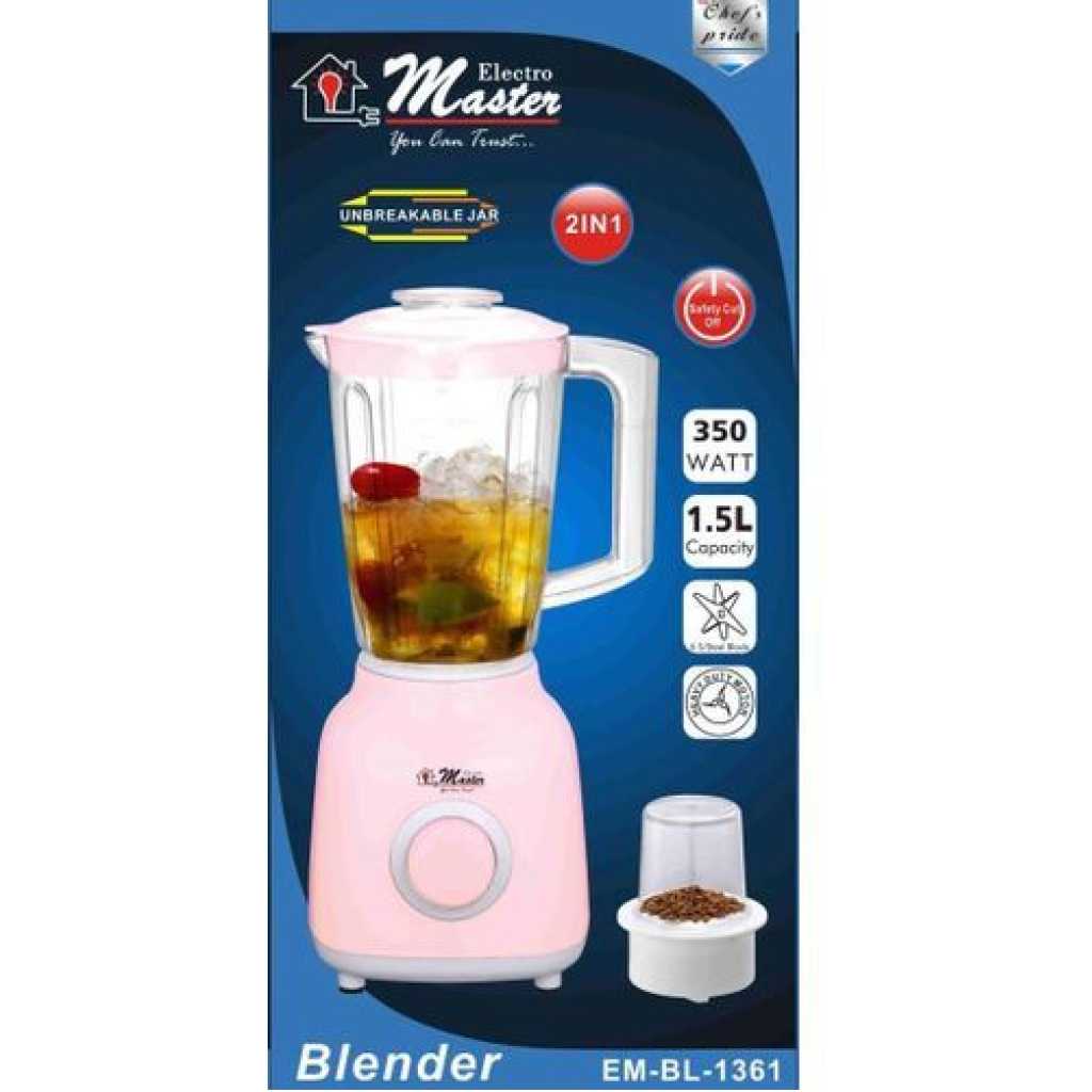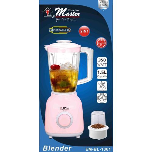 Electro Master 1.5L EM-BL1361 2-in-1 Blender – Pink. Electro master s Blender BL-1361 Whether you’re looking to make a nice smoothie to start your day, or a fresh salad for lunch, this Blender is the one for you. This product acts as a regular blender with a plastic jar, but also comes equipped with 2 other attachments for a glass jar and mill allowing you to carry out many different tasks with this one simple appliance. The pulse function gives you complete control as to how long you wish to run the blender on high-speed and also assists in the auto-clean function when used with a little warm water. We emphasize that the auto-clean feature is only useful for a quick clean-up but regular cleaning will still be required on occasion for a more effective job. Features 350 Watt Pure Copper Motor 1.5 liters jar capacity Unbreakable jar 2 attachments – plastic jar 2-speed control with pulse function Metal-lined grinding mill Stainless steel blades Auto clean system Key Features: Electro Master 1.5L EM-BL1361 2-in-1 Blender – Pink. 350 Watt Pure Copper Motor. 1.5 liters jar capacity. Unbreakable jar. 2 attachments – plastic jar. 2-speed control with pulse function. Metal-lined grinding mill. Stainless steel blades. Auto clean system.