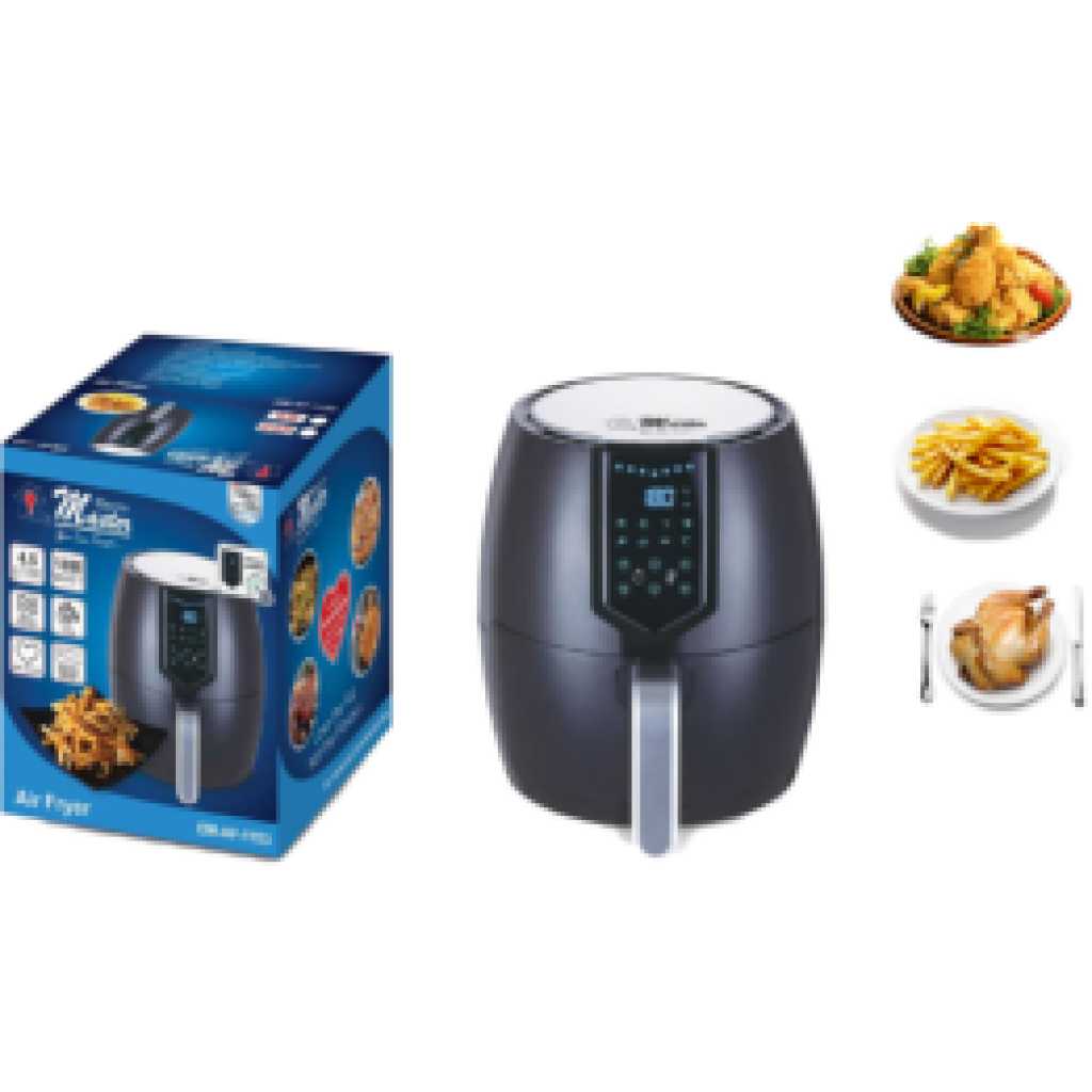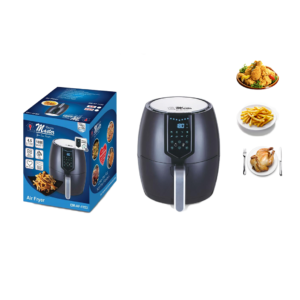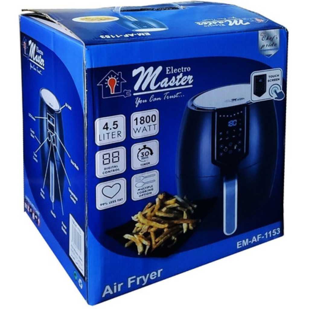 Key Features: Electro Master Digital Air Fryer EM-AF1153, 4.5L, 1800W Microcomputer Control Preset timer Over Heat Protection. LARGE CAPACITY -It has 4.5 L liters of cooking capacity, so you can easily cook enough healthy low-fat food to feed a small family using little to no oil. TOUCHSCREEN LED DISPLAY, DOUBLE PROTECTION – The fryer has a touchscreen LED display that lets you set the timer and temperature and also tells the progress of the food being fried. It has double protection layers for ensuring safety. You can cook various food items in it including fries, chicken, sausages, gammon, and more. NON-STICK BASKET WITH LFGB & FDA – This air fryer has a large capacity basket of 3.5L. You can cook meals for the whole family at a time. The basket is made entirely from non-stick material and is gentle on the food. It does not get greasy, so you can get your fried food out with ease. It is LFGB, FDA-passed, and safe for your health. OVERHEATING SAFE – No matter if you are busy doing some other work, this air fryer has an overheating protection feature that will turn off the air fryer after reaching the desired temperature as per your dish.