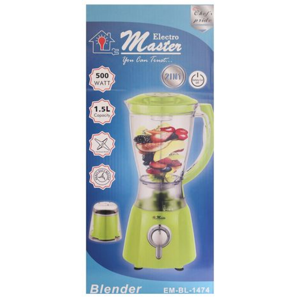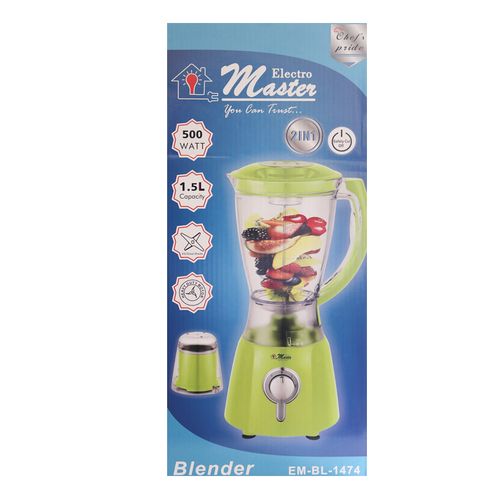 With this Electro Master 1.5L Blender, you can whip up delicious fresh fruit juices, smooth sauces, and homemade soups in an instant! It’s the perfect appliance for all your family favorites! Its sharp stainless-steel blades guarantee it will last you for a very long time, while its practical dosing cup makes it oh-so-easy to use! Simply open the lid and dosing cup to safely and easily add ingredients while the blender is operating.The mini-grinder opens up a whole new world of possibilities, allowing you to grind and grate your spices and ingredients in the blink of an eye. Blending has never been so easy! Key Features: 100$ Coper Motor Motor: 350W Stainless steel Blade 1 jar – 1.5L 1 Grinder 3 speed + pulse function High Quality plastic body Removable Accessories for easy cleaning
