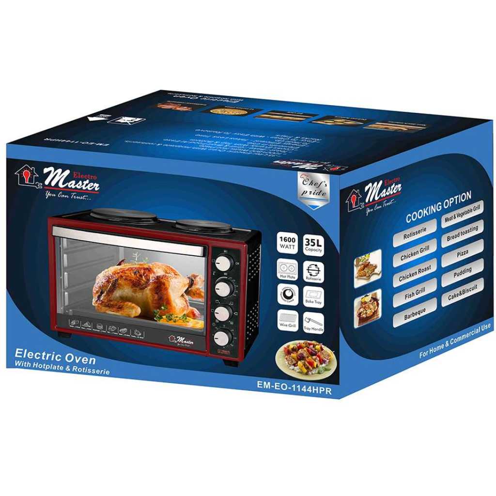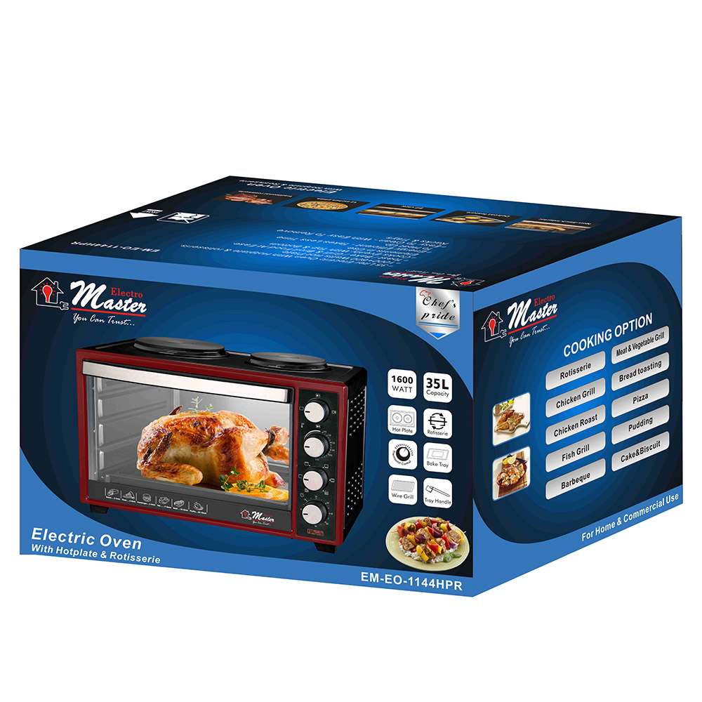 Electro Master EM-EO-1144-35HPR 35L Oven With Hot Plate – Black/Maroon. 1600 Watts 35 Litre Capacity Bell Ring Wire Grill Thermostat Control Bake Tray Hot Plate Tray Handles Key Features: Electro Master EM-EO-1144-35HPR 35L Oven With Hot Plate – Black/Maroon. 1600 Watts 35 Litre Capacity Bell Ring Wire Grill Thermostat Control Bake Tray Hot Plate Tray Handles