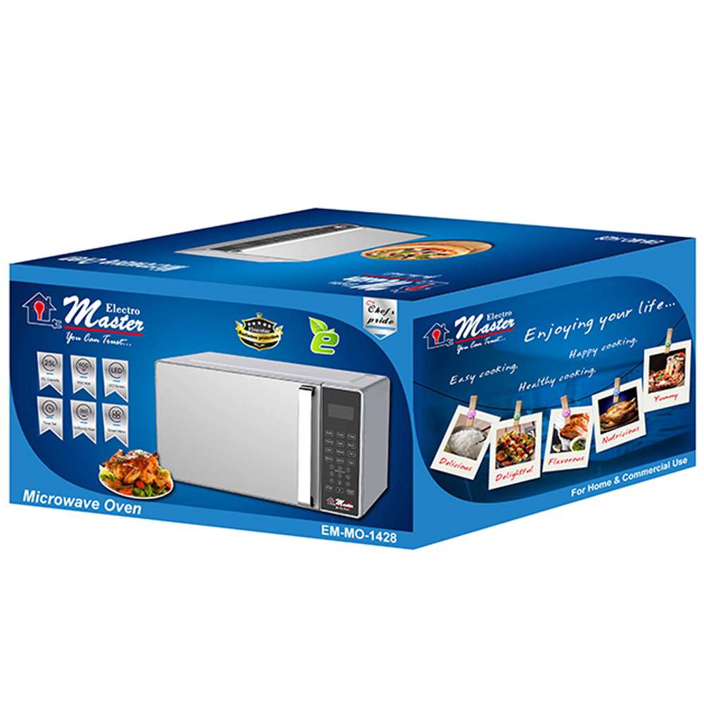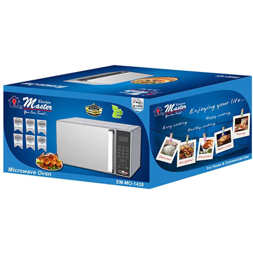 Electro Master EM-MO-1428 25L Digital Microwave Oven – Silver. 900 Watts 25L Capacity LED Screen Timer Set Uniformly Heat Smart Menu Radiation Protection Key Features: Electro Master EM-MO-1428 25L Digital Microwave Oven – Silver. 900 Watts 25L Capacity LED Screen Timer Set Uniformly Heat Smart Menu Radiation Protection