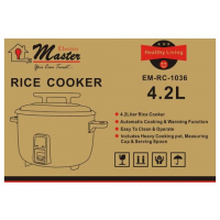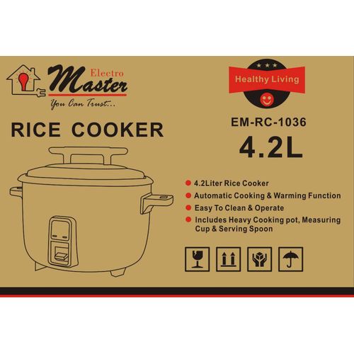 Electro Master EM-RC 1036 Rice Cooker 4.2ltr – White This Rice Cooker is compact and efficient, making it the perfect addition to any kitchen. Cook rice, fish, vegetables, and a variety of other foods with the help of this simple, easy-to-use kitchen appliance. Featuring a high-technology textured inner cooking pot to enhance nutrition and a removable, dishwasher-safe lid, the rice cooker is perfect for busy cooks. Cook or keep food warm with the touch of a button and never worry about burning yourself with useful insulated handles and a cool wall for user safety. Key Features: Electro Master EM-RC 1036 Rice Cooker 4.2ltr – White. Capacity: 4.2 Litre Rice Cooking Keep Warm Steaming Dishwasher Safe 1650 Watt Bs plug