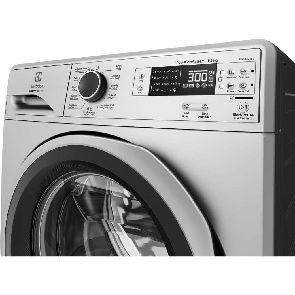 Electrolux Ultimate Care300 Washing Machine 6Kg- EWF6240SS5 – Silver – Silver No more visible detergent residue. AntiAllergy Steam removes 99.9% allergens and germs*. EcoInverter motor uses up to 50% less energy*. Goodbye detergent residues* With UltraMix technology, detergent and softener is thoroughly dissolved and activated before it enters the drum. This ensures that your clothes are cleaned without leaving visible detergent residue at the end of the cycle. With UltraMix you can say goodbye to visible detergent residue and forget rewashing*. *Tested on a 3kg mixed load of colour T-shirts and shirts, using recommended powder detergent dosage and load size. Results may vary depending on load size, detergent type and water pressure. Clean with added hygiene The HygienicCare option finishes the wash cycle with a soft spray of vapour to remove up to 99.9% of allergens and germs.* HygienicCare produces vapour at just 40°C, so it is gentler on your fabrics, whilst also saving energy. *Electrolux front load washers with Vapour / Hygienic Care option remove up to 99.2% of Der f1 (dust mite) and Fel d1 (cat allergen) and upto 99.9% of Staphylococcus aureus and Klebsiella pneumonia during a 40°C cottons wash. 50% more efficient The EcoInverter motor reduces vibration to deliver quiet, reliable performance with up to 50% lower energy consumption compared to traditional models*. Plus it’s guaranteed for 10 years. Fast, flexible cycles Adapt your laundry load to suit your schedule. The Quick 15 Cycle delivers an efficient, 15-minute wash suitable for a small amount of clothes or single items. The Daily 39 program is ideal for your soiled daily loads. And for a regular full load, set to the Full Wash 60 cycle, the ideal one-hour program. Easy care for wool Safely wash your treasured woollen items with the Woolmark approved cycle. This gentle program combines low temperatures with very low spin speeds to care for “machine-washable” woollen garments. *The wool wash cycle of this machine has been approved by The Woolmark Company for the washing of machine washable wool products provided that the products are washed according to the instructions on the garment label and those issued by the manufacturer of this washing machine. M0000. Conveniently addclothes Have you ever started a wash cycle only to realise that you’ve left a sock at the bottom of your laundry basket? The AddClothes function allows you to pause the wash to add forgotten items up to 15 minutes after the cycle begins. Features No. of programs- 10 Motor-EcoInverter Variable temperatures Antiallergic Steam Woolmark approved – Certified Quick cycles Timer delay