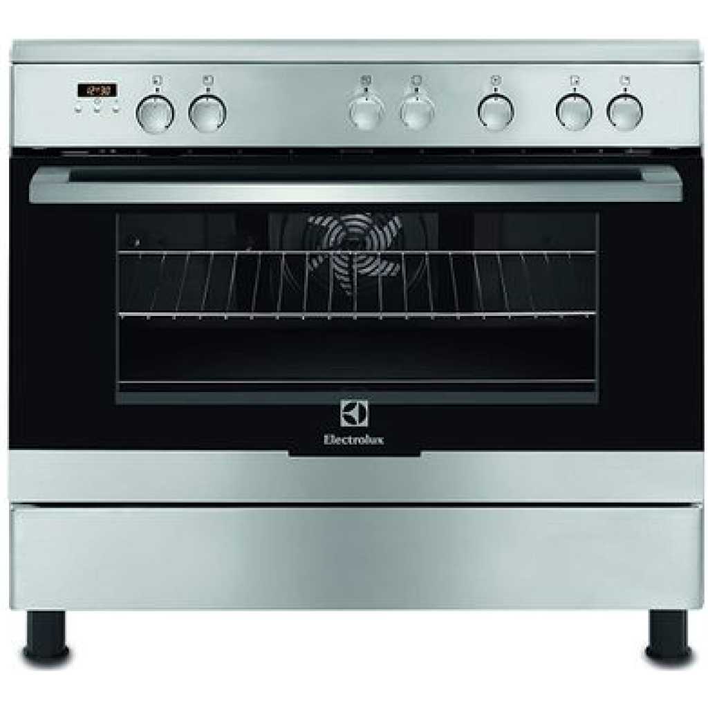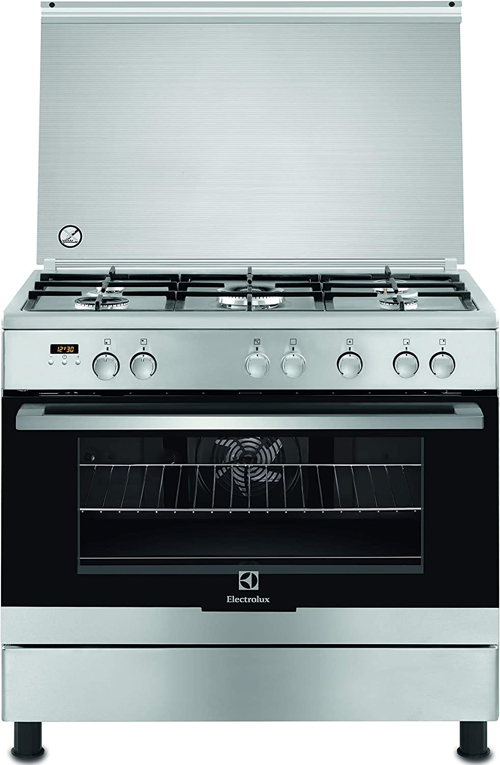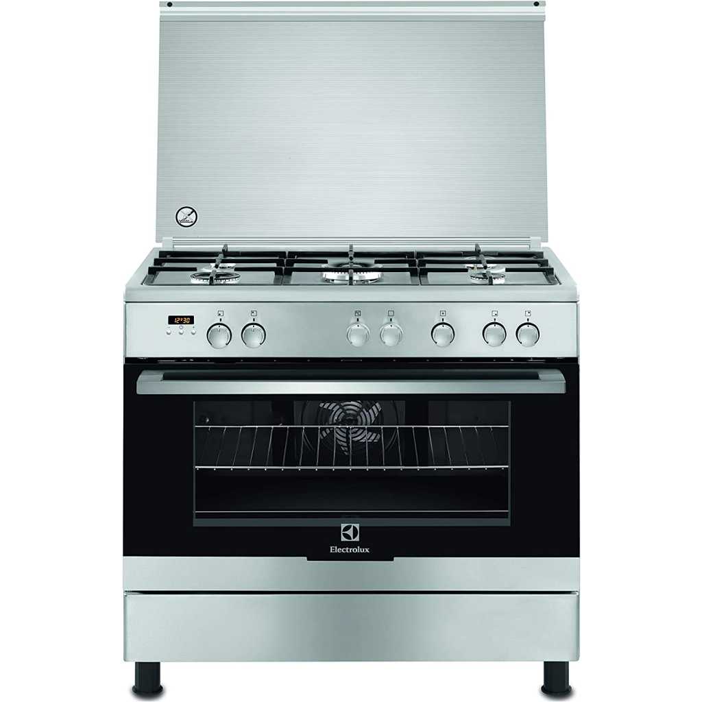 Electrolux Full Gas Cooker 90X60cm EKK925A0OX; 5 Gas Burners, Electric Oven & Grill, Thermostat & Rotisserie, Multi-Function Oven, Steel – Silver.. From the manufacturer Key Features: Electrolux Full Gas Cooker 90X60cm EKK925A0OX; 5 Gas Burners, Electric Oven & Grill, Thermostat & Rotisserie, Multi-Function Oven, Steel – Silver. XXL Fan ensures heat is circulated evenly throughout the oven, meaning consistent results wherever your food has been placed. Easily fired up – All it takes to start up this hob and oven is a simple twist of the knob whilst pressing down the knob, so the flame will be sparked. Saftey – Automatic gas cut-off, a practical solution and peace of mind Separate control knobs – you can grill and bake multiple dishes at the same time Automatic turnspit – The easiest way to make the perfect roast and easy to use Cast iron pan supports – A robust and durable cooking support