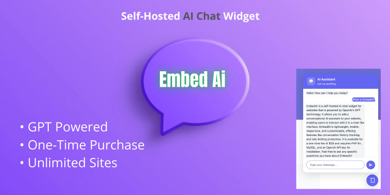 EmbedAI - Self-Hosted AI Chat Widget for Websites. Add a GPT-powered AI chatbot to any website. Self-hosted, one-time purchase, unlimited sites. Easy setup with admin panel.