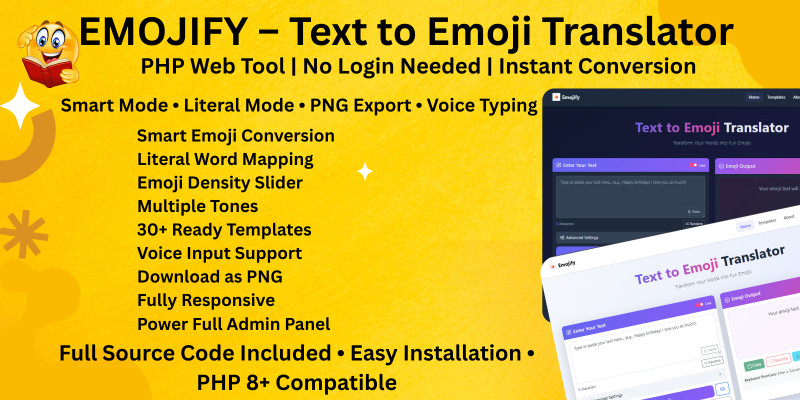 Emojify – Text to Emoji Converter PHP. Instantly convert text to emoji-rich captions with smart AI logic, templates, PNG export, and a powerful admin panel.
