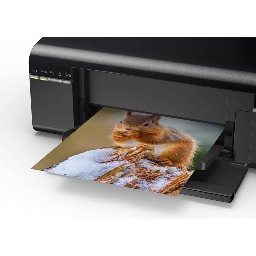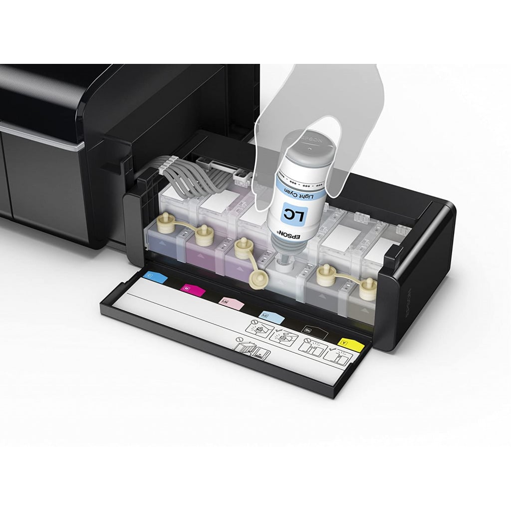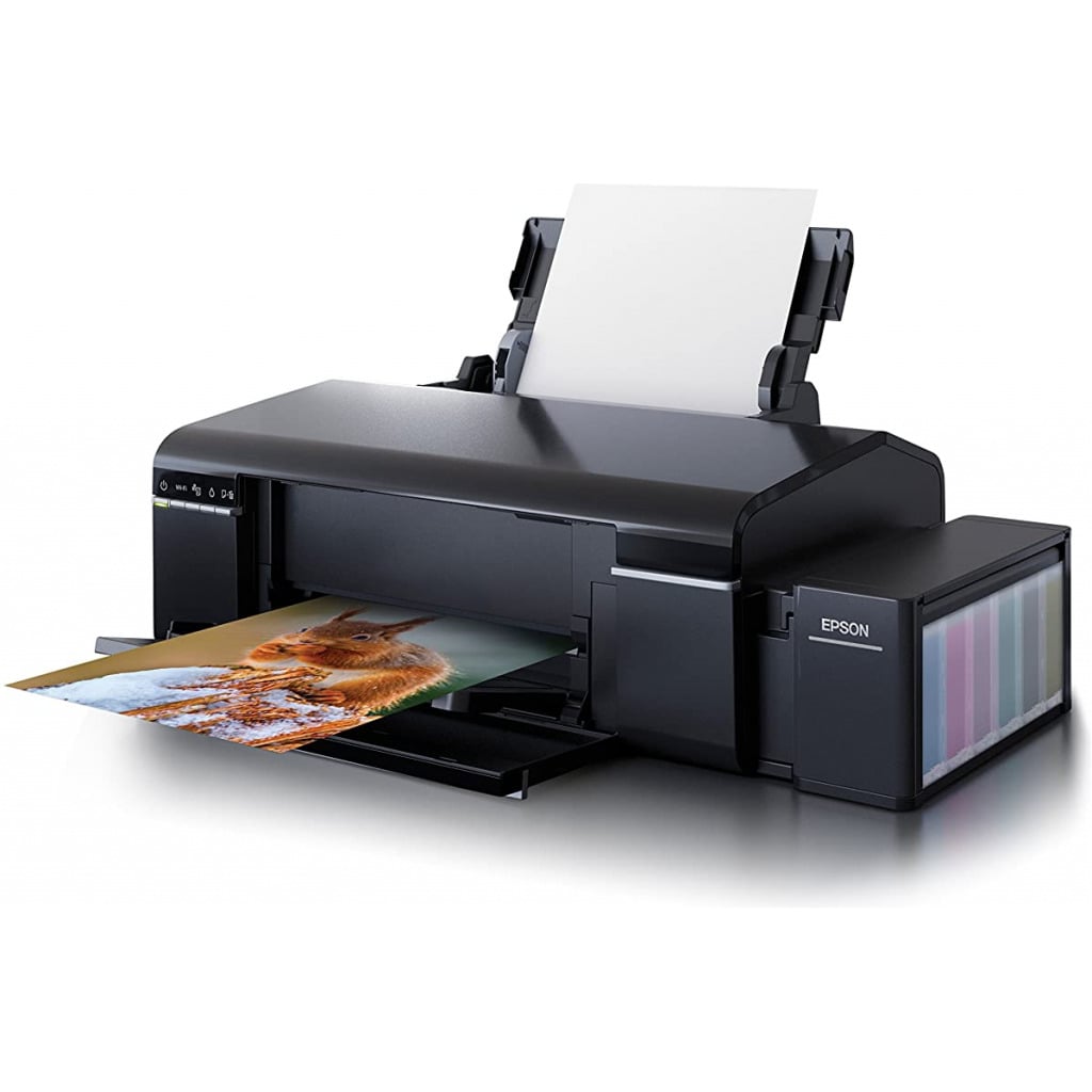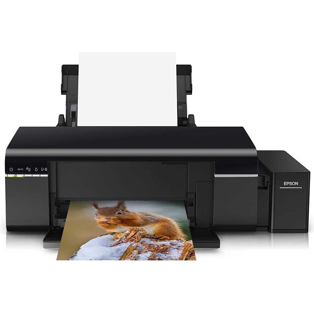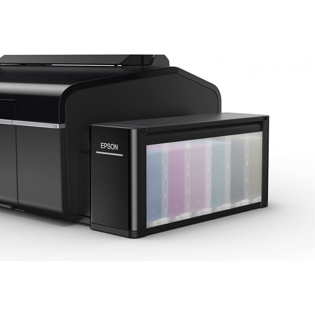 Key Features: EPSON EcoTank L805 WiFi InkTank Photo Printer – Black Printer Type – InkTank; Functionality – Single Function (Print only); Printer Output – Colour, Borderless Printing Connectivity – Wi-Fi, USB, Epson iPrint App ; Noise Level:- PC Printing / PGPP Best Photo: 5.1 B(A), 36 dB(A), PC Printing / Plain Paper Default *3: 6.0 B(A), 48 dB(A) ; Supported OS: Windows XP / Vista / 7 / 8 / 8.1 / 10, Mac OS X 10.6.8 or later Compatible Ink Bottle – T673 (Black, Cyan, Magenta, Yellow, Light Magenta, Light Cyan) ; Page Yield – 1800 R4 photos – As per ISO standards Warranty – 1 year from the date of purchase, With a photo print speed of up to 12 seconds per 4R photo*, you can achieve much more with less time Pages per minute – 5 ; Cost per page – 2 Rs per photo (Colour) – As per ISO standards Page size supported – A4, A5, A6, B5, Letter, Legal, DL, Envelopes ; Duplex Print – Manual ; Print resolution – 5,760 x 1,440 dpi Ideal usage – Photo printing, regular usage