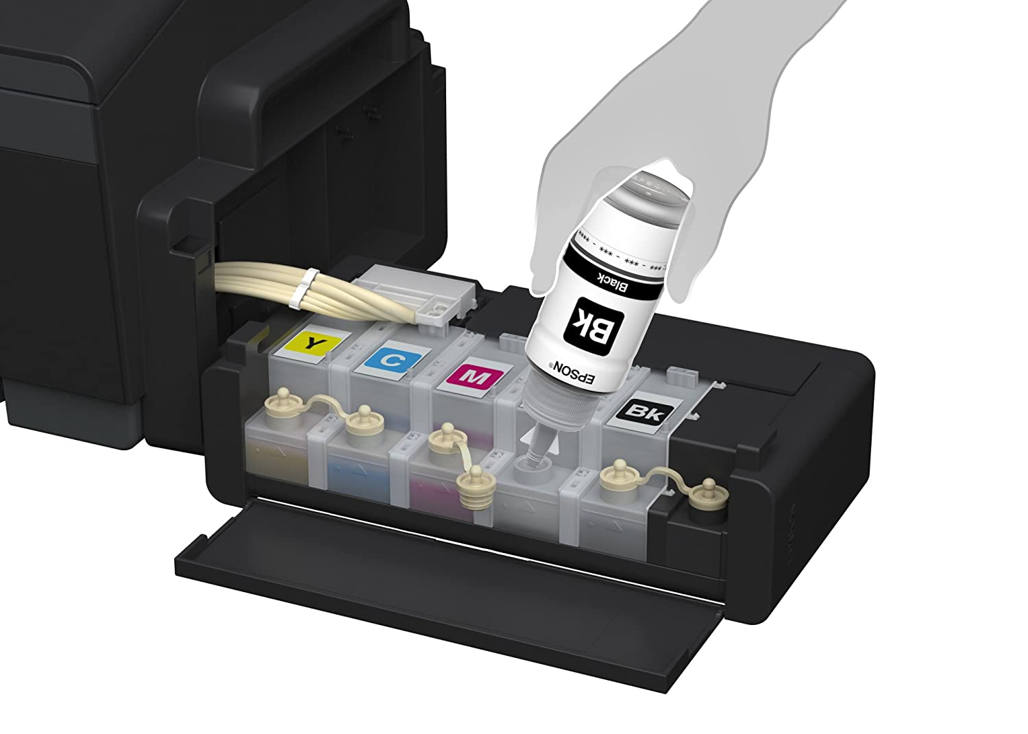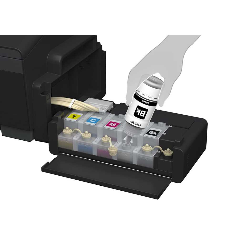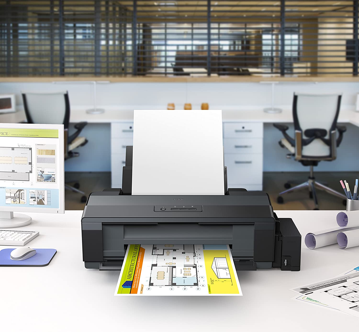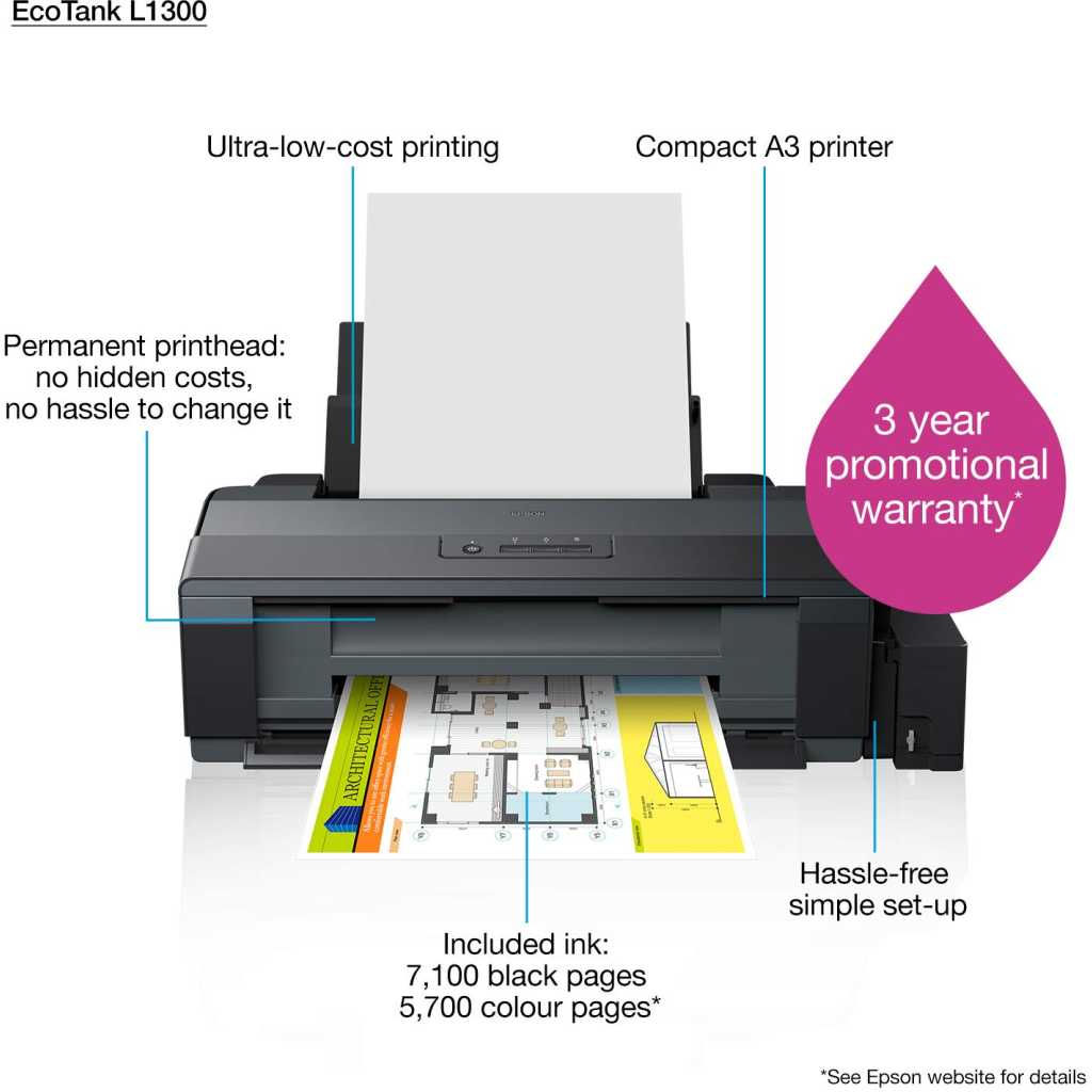 Epson L1300 A3 4 Color Printer (Black). A3+ PRINTING AT A LOW COST, HIGH VOLUME PRINTING The Epson L1300 is the first 4-color, A3+ original ink tank system printer in the world, significantly lowering the cost of publishing high-quality A3 documents. bottle high-yield ink Up to 15 ipm at a maximum resolution of 5760 x 1440 dpi 2 year 30,000 page warranty, whichever occurs first A3+ size prints You can print larger documents up to A3+ size using the L1300. This creates opportunities for greater presentations of intricate CAD drawings, floor plans, business reports, and charts that are more advanced than those produced by standard A4 printers. Excellent Page Yield and Savings Greater savings are made possible by integrated ink tanks with enormous capacity and genuine ink bottles that are extremely economical at just S$9.90 apiece. The L1300 produces up to 7,100 pages (black) with the starter set of 5 bottles of Epson Ink included. According to Epson’s original technique, quoted yields were extrapolated from the print simulation of the Test Patterns described in ISO/IEC 24712. The yields that are quoted are NOT based on ISO/IEC 24711. Actual yields may differ based on usage type and print pattern. The yield from two black ink bottles is 7100 pages. High Productivity Designed The L1300 has a cutting-edge printhead that allows for quick print speeds of up to 15 ipm (black). Very Dependable and Excellent Printing Epson’s acclaimed Micro PiezoTM printhead, which is built for continuous printing performance, has an amazingly high resolution of 5760 dpi in addition to being extremely reliable in operation. The L1300 produces prints of an extraordinarily high caliber for both your commercial and creative needs when used with genuine Epson designed inks. Media Versatility You can easily complete all types of printing tasks with the L1300’s rear-feed tray since it supports a wide range of printing media, including thick paper, picture paper, envelopes, labels, and more. The original ink tank system from Epson is built for streamlined, mess-free operation in commercial and small office settings. Luminous Qualities. Long-Term Value Genuine Epson ink bottles are individually sealed to guarantee the quality of their contents and are designed to produce exceptional high-volume prints with L-Series printers. For long-lasting quality and affordable printing expenses with your L-Series printer, choose Epson authentic ink bottles. Warranty for Peace of Mind for One Year Enjoy a guarantee that lasts for a year or 30,000 prints, whichever comes first, to get the most out of your printer and be worry-free about maintenance.